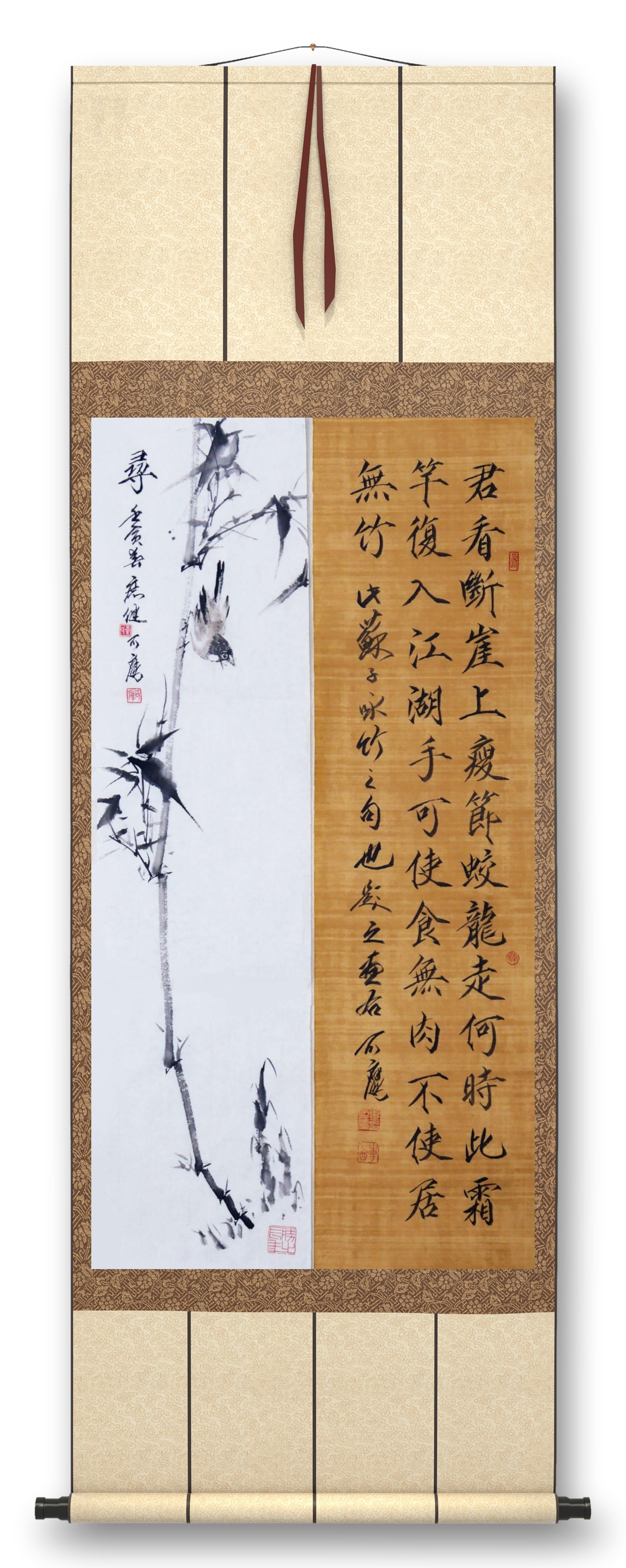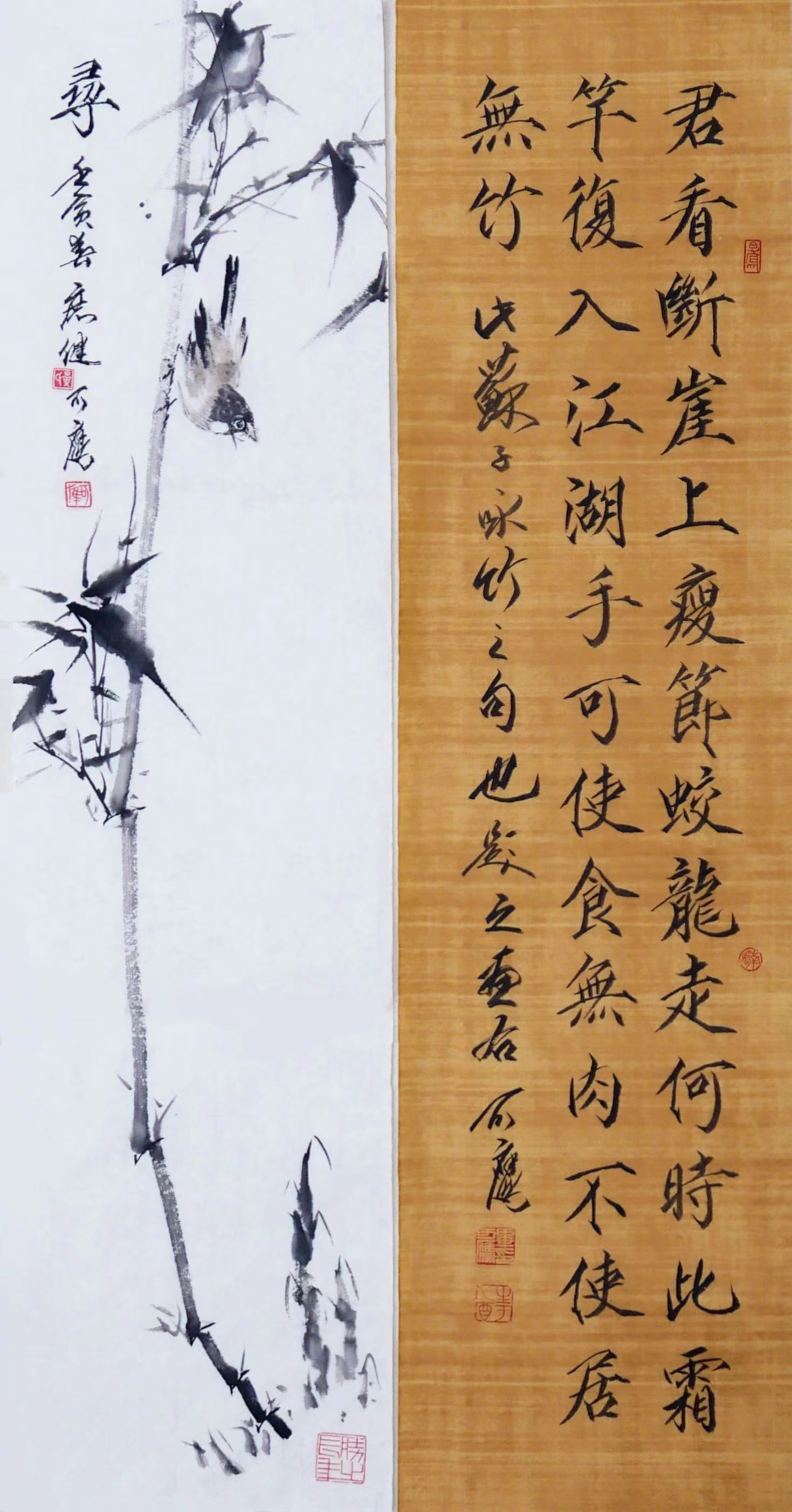 为画配字大多横写,称为“诗堂裱”,今天试一试竖着写,故意用不同的纸张、不同的颜色,通过装裱使之形成“和而不同”的效果。