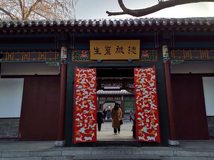 二扇对开朱漆板门各布“九九”八十一枚鎏金铜门钉,取意“九九归一”。