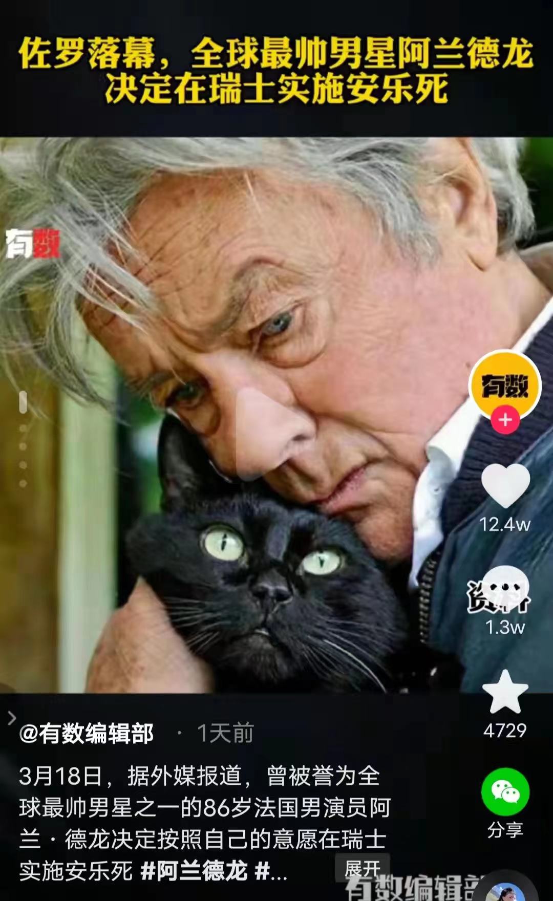 外媒称,曾被誉为“全球第一美男”的86岁法国巨星阿兰·德龙,决定在自己失去意识后,于瑞士以安乐死的方式结束余生。