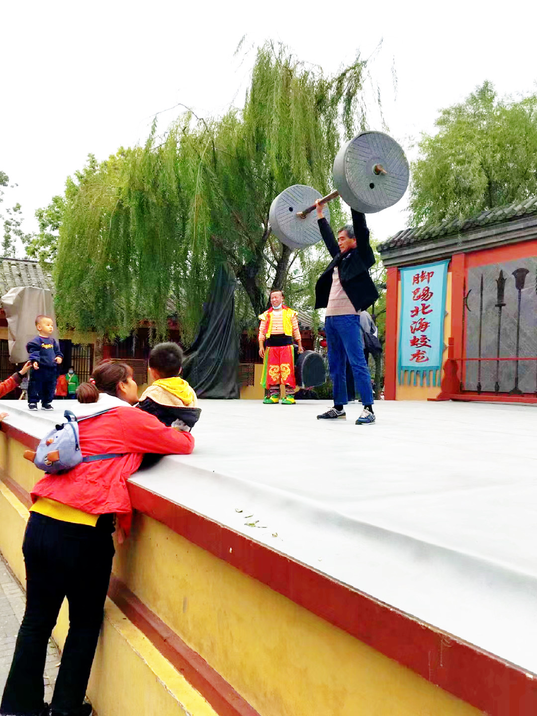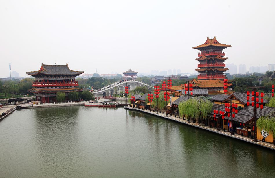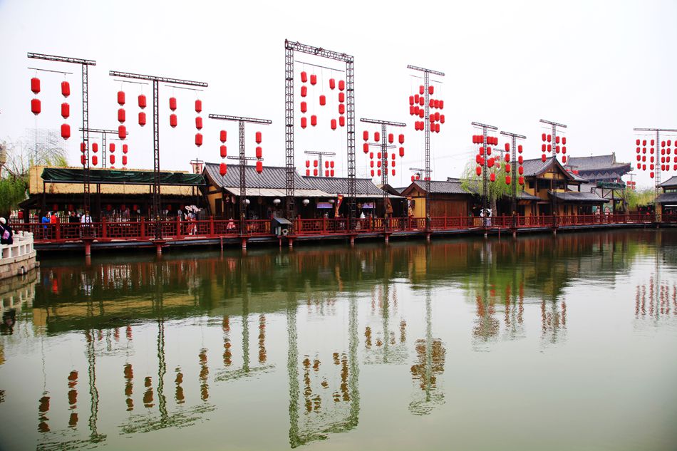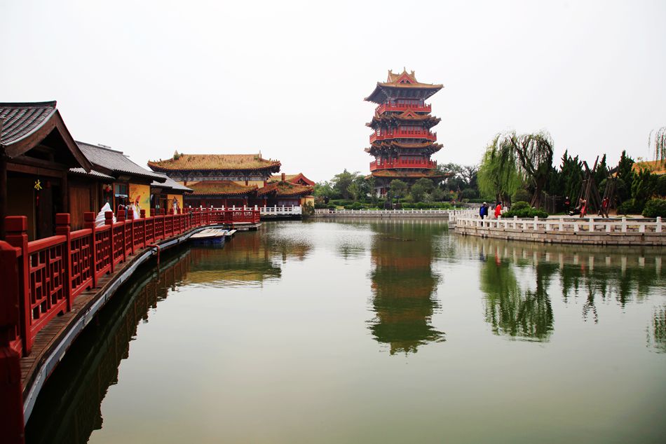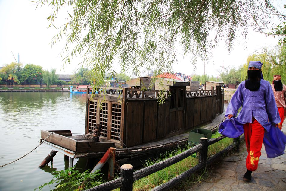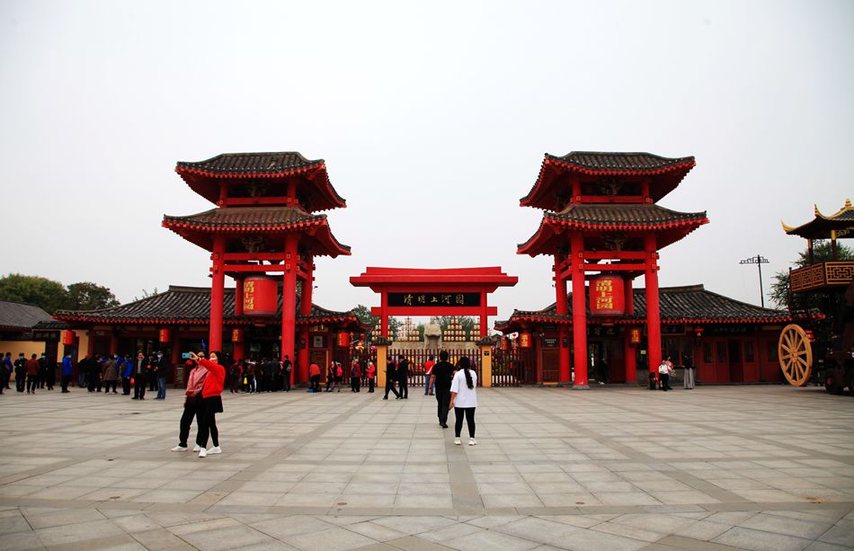 从龙亭公园到清明上河园有一段距离,我们选择沿着湖边步行。这座湖很宽广,东为潘家湖,西为杨家湖。湖面有游船往来穿棱,湖边有许多行人。走着走着还听见有人唱豫剧,行到近前,原来是一妇女正唱的津津有味,旁边还围着听众。我站着听了一会,啥也没听懂,迤逦前行就到了清明上河园。可能在开封没有什么比清明上河园更能吸引我了,对这座知名园林,我向往了许久。本来这个景点安排在第三天用一整天的时间参观,因没看成龙亭,只好提前观赏了。好在是上午十点,玩到傍晚有足够的时间。