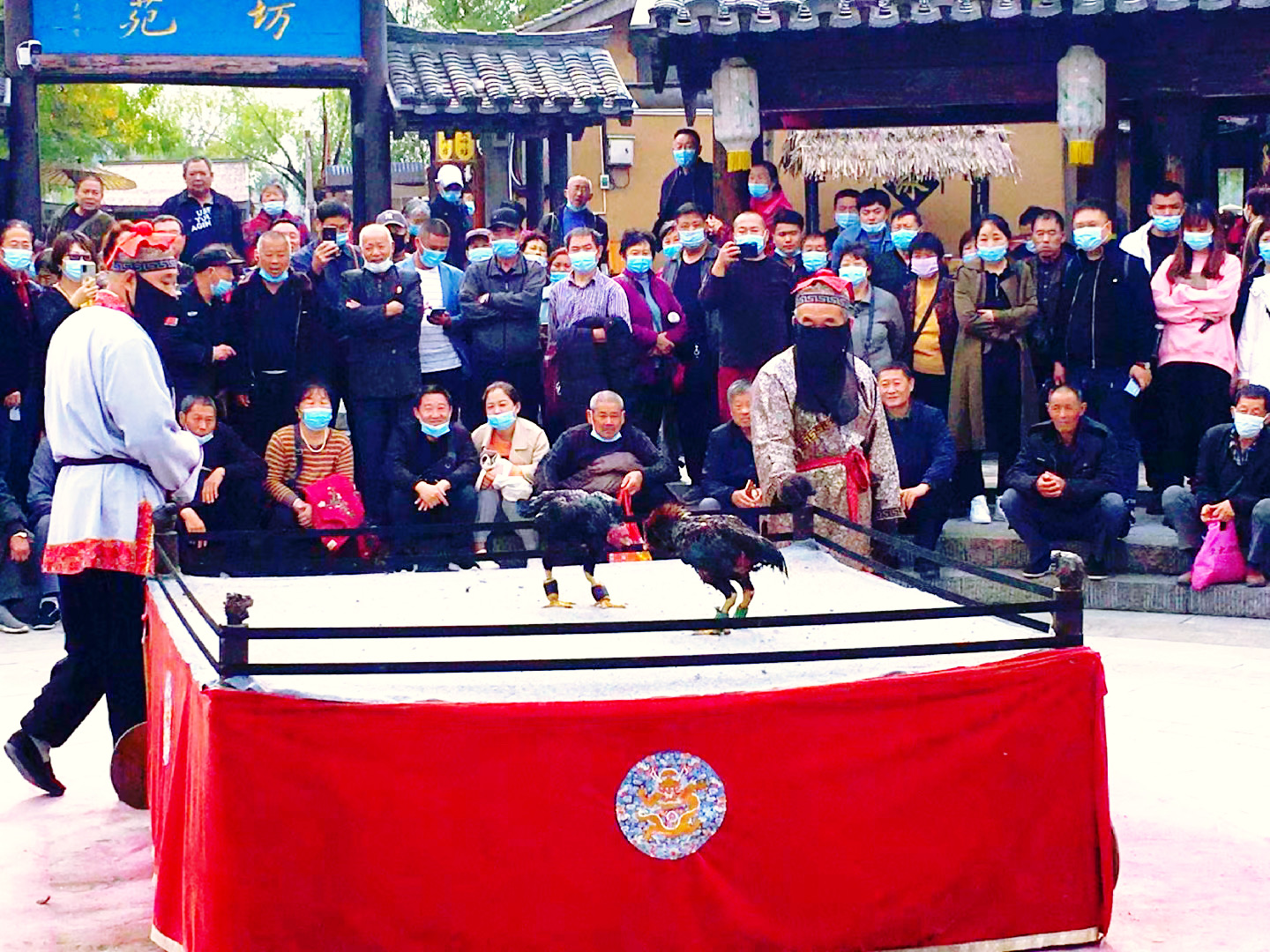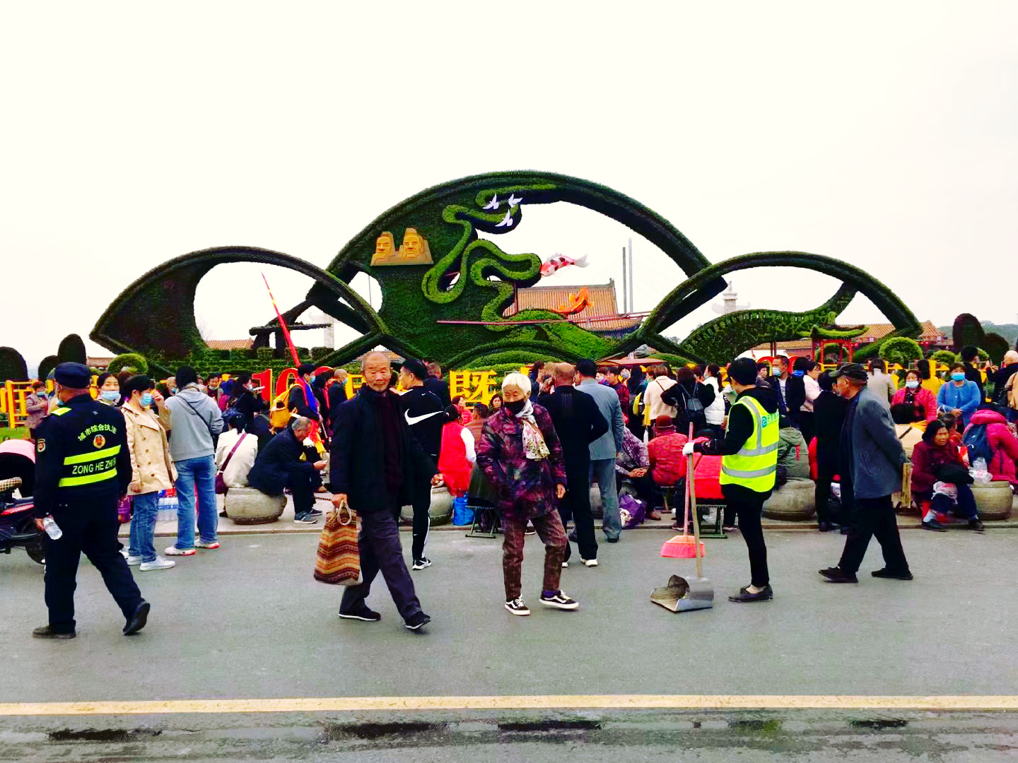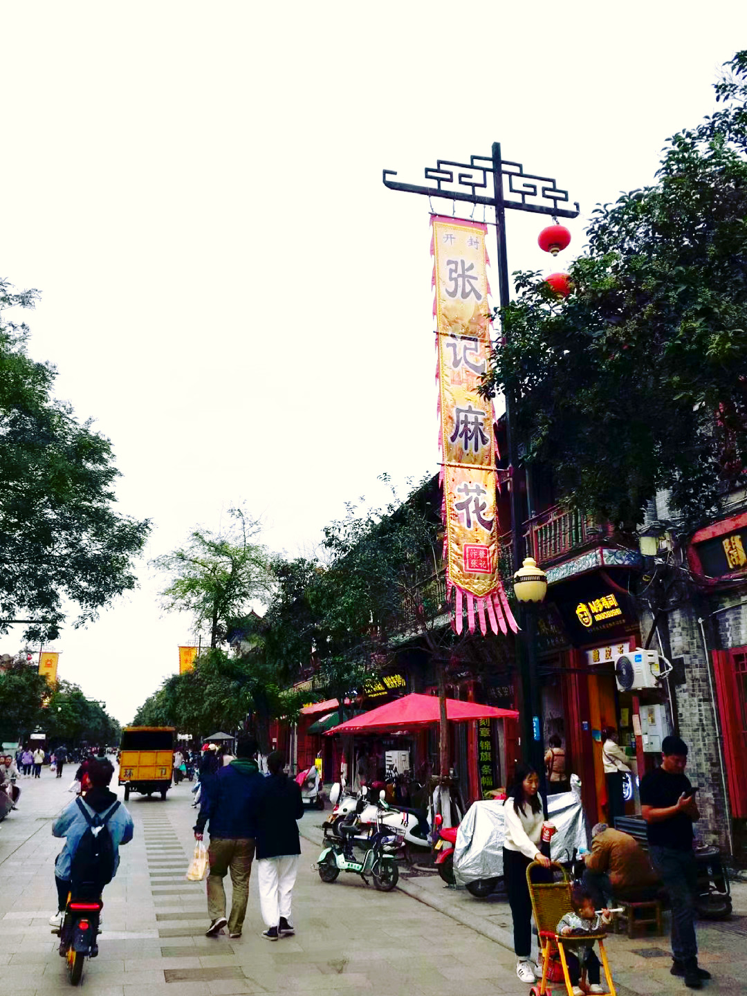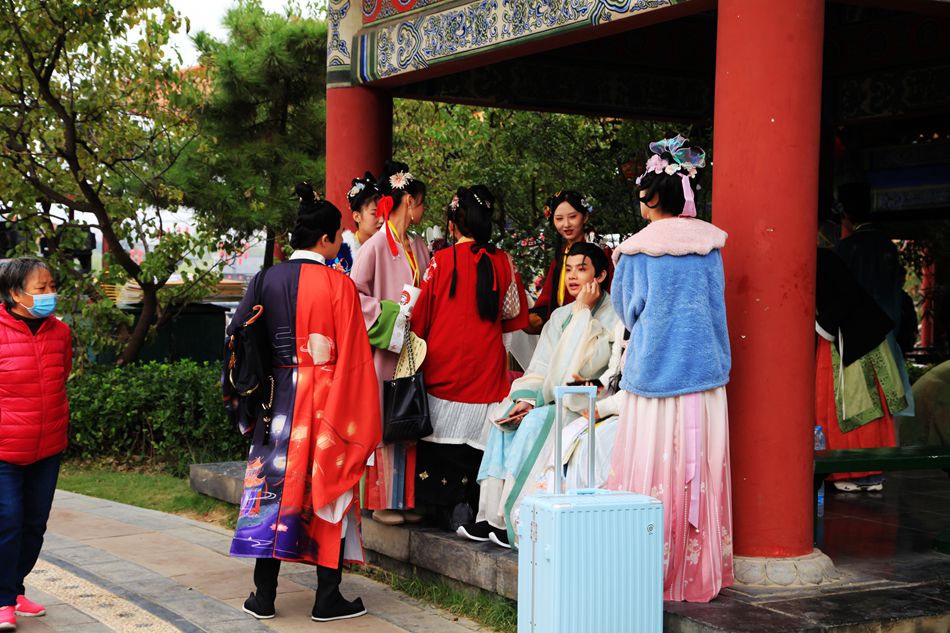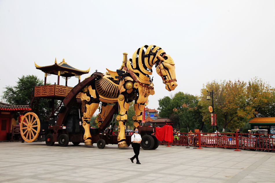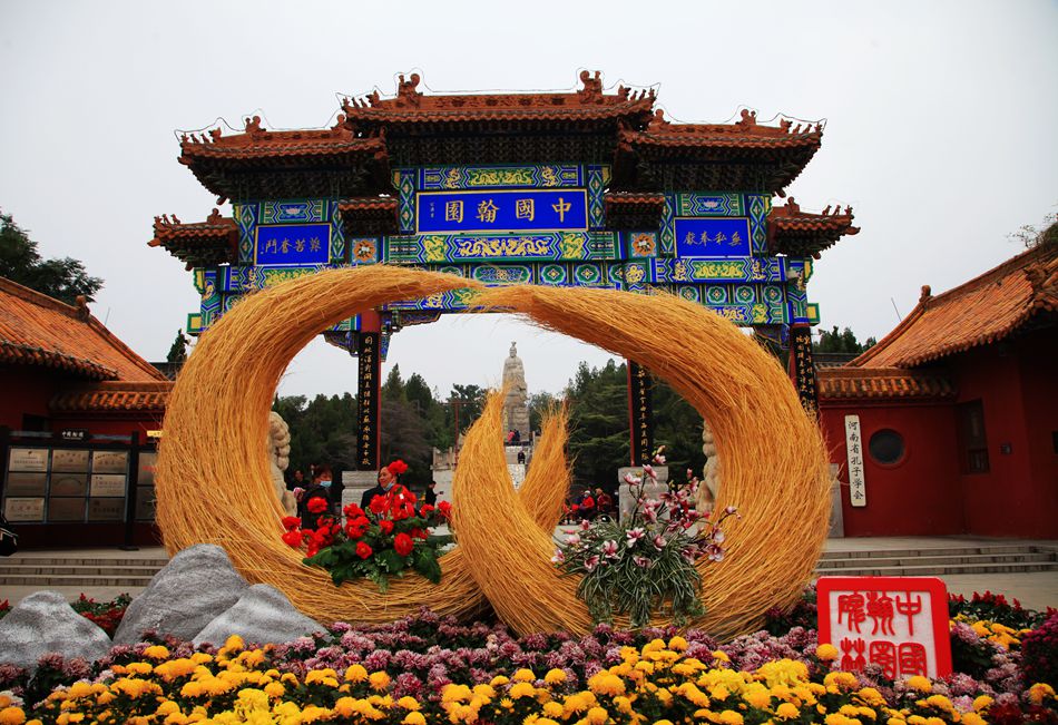 当我们走到宋都御街时,天空飘起零星小雨。撑起伞,穿棱于街道,看两侧鳞次栉比的房屋,看高挂的匾额和楹联,看大牌坊上的石雕,令人有时光倒溯,仿若回到千年前的汴京之感。宋都御街走到头就是龙亭公园。远远的就望见乌泱泱的人群,行到近前,不得了,龙亭广场人山人海,水泄不通。连马路都被堵塞,有交警在维持秩序。问之,原来这天是重阳节,万名老人来龙亭公园碑亭祈福、拜神。我和妹妹跟着人群往里挤,挤着挤着就被挤了出来,脚下还有坐着的老人,如果踩空了,一倒一面,非常危险。我又听旁人说今年节气晚,公园里菊花没有开。我们遂放弃游龙亭公园,改去清明上河园。