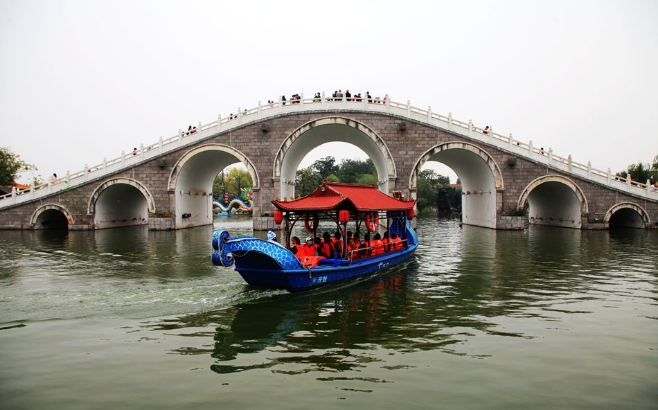 九龙桥是清明上河园最长的桥,采用联拱结构修建,是一座古桥。它不仅方便了过往的行人,同时也为后人留下了一座艺术精品。坐在桥下拍照,或登上桥观赏,都会让你有所收获。游清明上河园,更像是一场时间和艺术的旅行,一天的时间就穿越到张择端的《清明上河图》中,展开一场如诗如画的旅行,真是太值了。然而,美中不足是天气不好,一整天都乌蒙蒙,有时还飘雨,拍的照片不好看。可是,过足了眼瘾。园中晚上还有大型演出《大宋——东京梦华》,我们没有观赏,留下了遗憾。