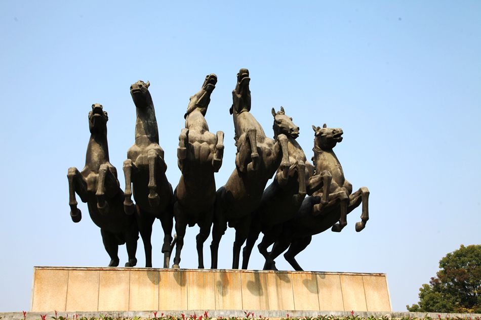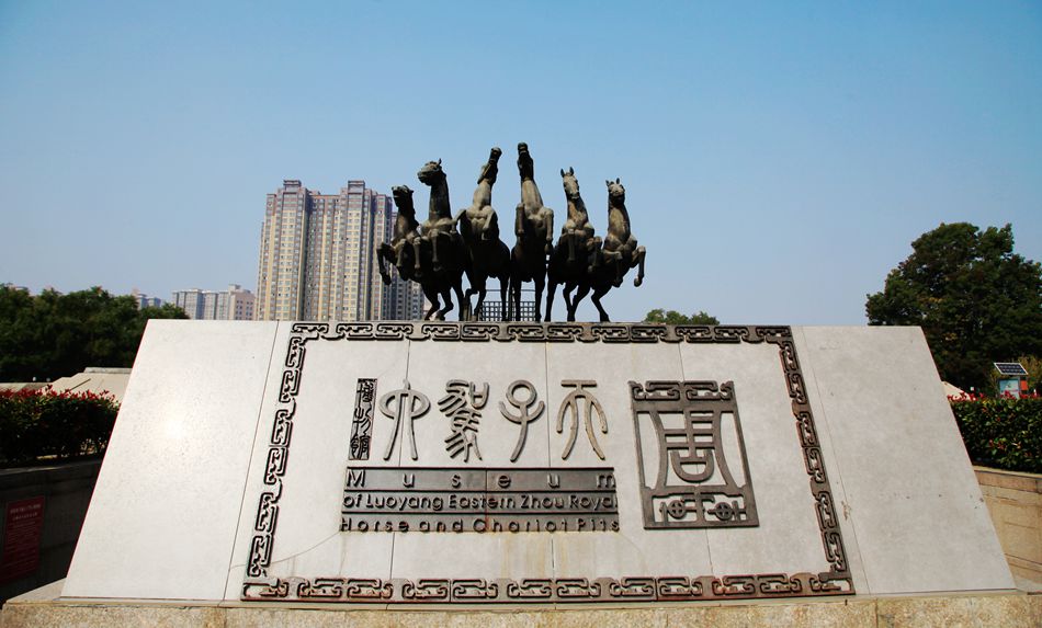 从九府水席出来,看看时间尚早,我们去了天子驾六博物馆。在市中心露天广场,矗立着六马拉车的雕塑,这些马形象各异,仰天长啸,气势非凡。下面有是一座博物馆,需买门票方可进入。这座博物馆很小,是微缩考古现场。第一展区展示的是东周时期洛阳城作为周天子王城的历史介绍,还有一些东周时期的青铜器。第二展区展示的是东周墓葬和车马坑,令人震撼的是马坑内的一辆“驾六”车马遗迹,这是当年周天子所乘坐的马车。这里是博物馆重点参观区域。参观仅用半小时。如果对历史不感兴趣的朋友,我觉得没必要进去,在上面看看这驾六马车雕塑就很好。
