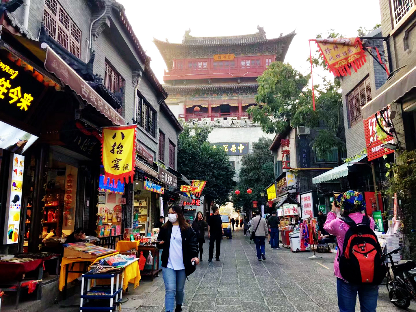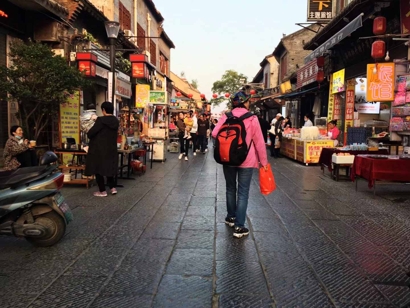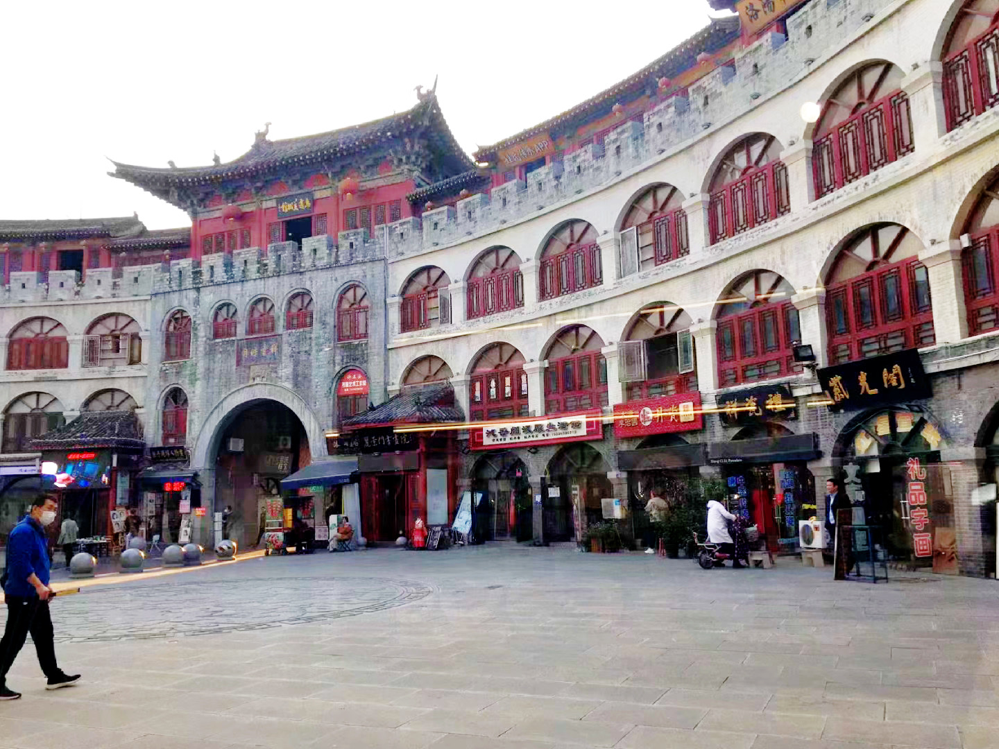站在六驾博物馆广场,看看西斜的太阳,我和妹妹去了丽景门看夜景。丽景门离我们住的酒店很近,离六驾广场也不远,步行既可。丽景门被誉为中原第一门,有人说:“不到丽景门,枉来洛阳城”。丽景门在洛阳十字老街上,傍晚,老街热闹非凡,各种小吃一字排开,美食琳琅满目,让人目不暇接。叫卖声、喇叭声,音乐声此起彼伏,喧嚣无比,震耳欲聋。走在老街上,仿佛走进了古代的市井生活里,尤其路边卖牛肉的摊子,让我想起武松过景阳岗大块朵颐,大碗喝酒的场面。虽说是当今社会,可遗留的古风犹存,让人大开了眼界。