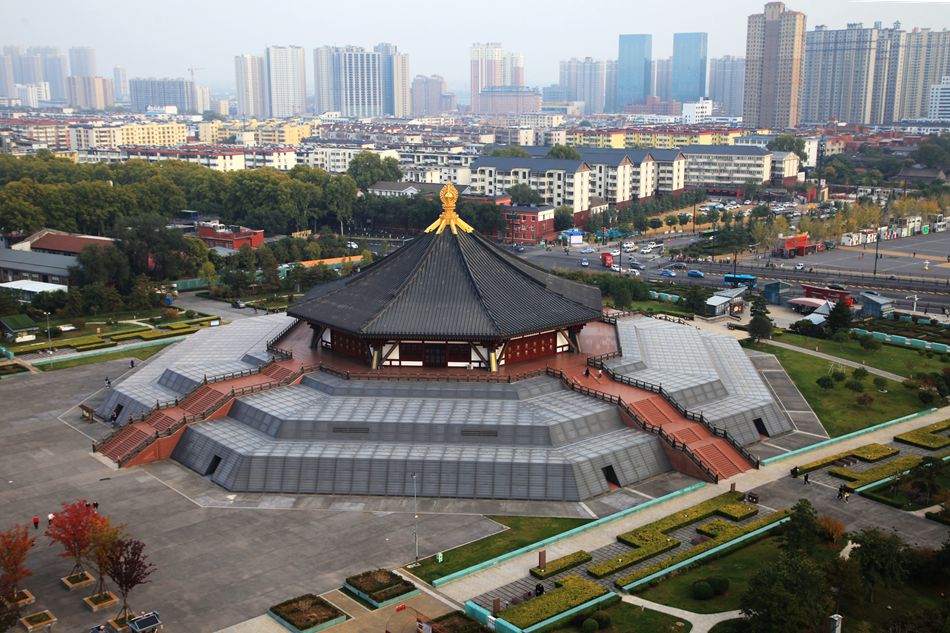 明堂宏伟壮丽,它是宫城的正殿。当年唐高宗和武则天一统天下,执掌国政就在这里办公,也是女皇祭祀天地,举办神宫大乐舞的朝堂。里面富丽堂皇,除了一、二层,还有地下展厅。我们在一层观看了一场古装实景演出,有武则天临朝和霓裳羽衣等节目。舞女们翩翩起舞和女皇君临天下的威仪,尽显大唐盛世的风采华章,不禁让人赞叹和浮想联翩。里面还有免费的弧形巨幕电影可以观看,影片将古都洛阳的辉煌历史淋漓尽致地展现出来。