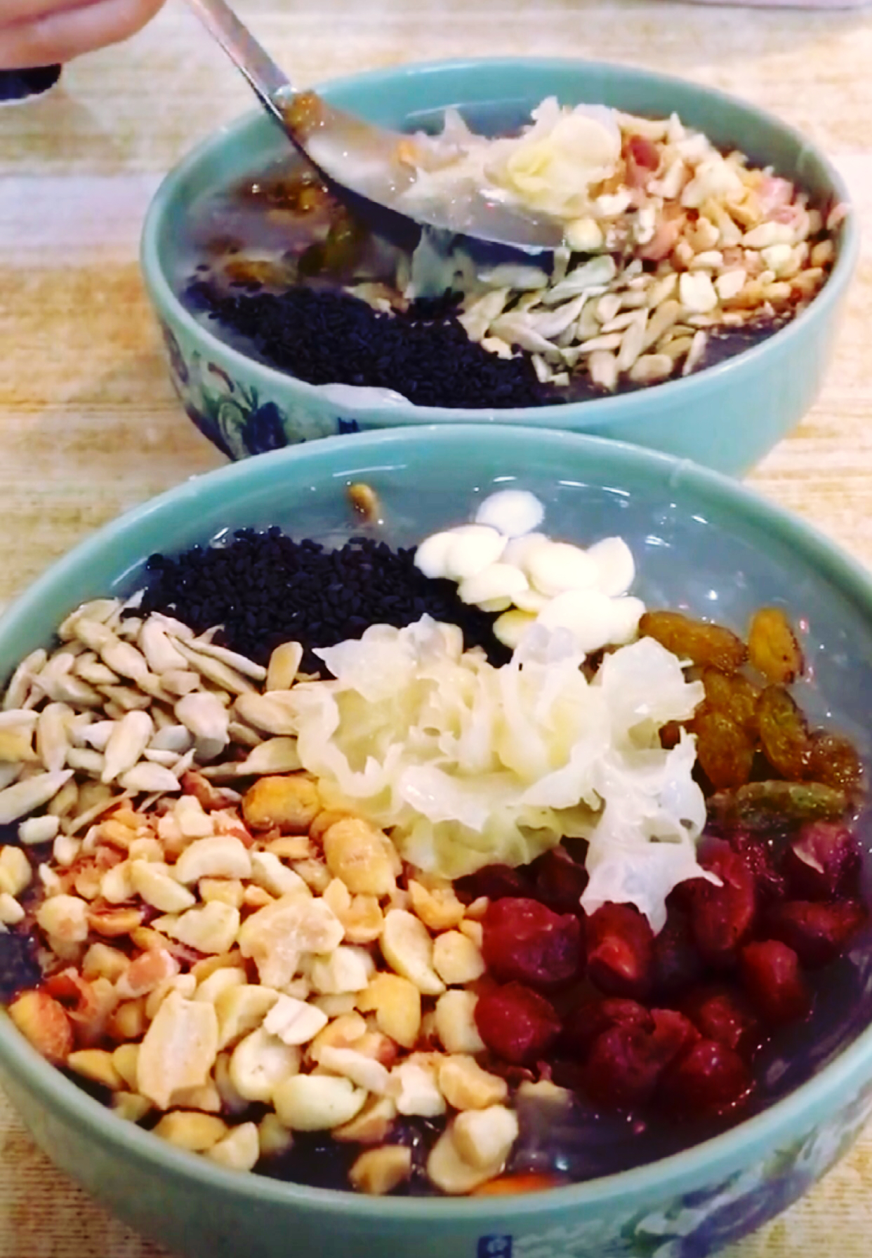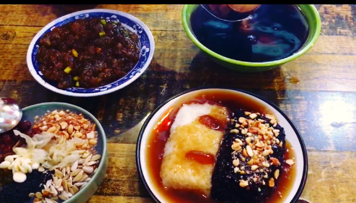 特别是那碗宫廷杏仁茶,里面满满的都是料,有杏仁、银耳、花生碎、黑芝麻、葡萄干,瓜子仁、用藕粉调制,超极好吃。更重要的是物美价廉,一大碗杏仁蜜仅7元,这要是在我们那里没有个二、三十元是拿不下来。还有那个双色切糕,一黑一白两块,淋上玫瑰露,黏糯有嚼劲,香中带甜,口感超棒。那碗玫瑰梨水,清润养肺,有淡淡的玫瑰香气。当然还有羊炕馍也是这家的招牌,可是我们不吃羊肉。十梨香让我吃不够,为此,离开洛阳的时候,我们又来吃了一次。尽管那天不饿,仅在这里喝了一碗梨水,和杏仁蜜。
