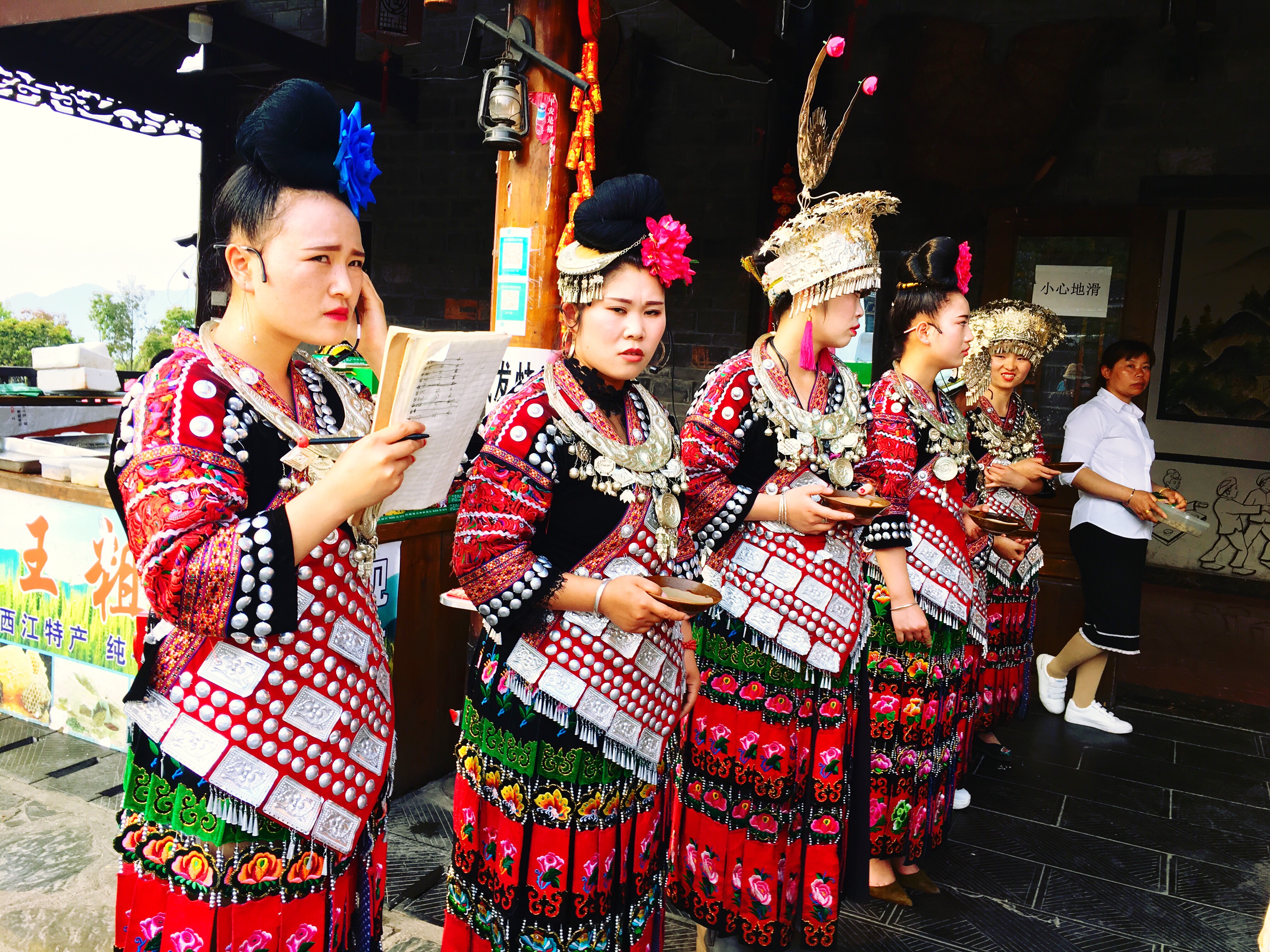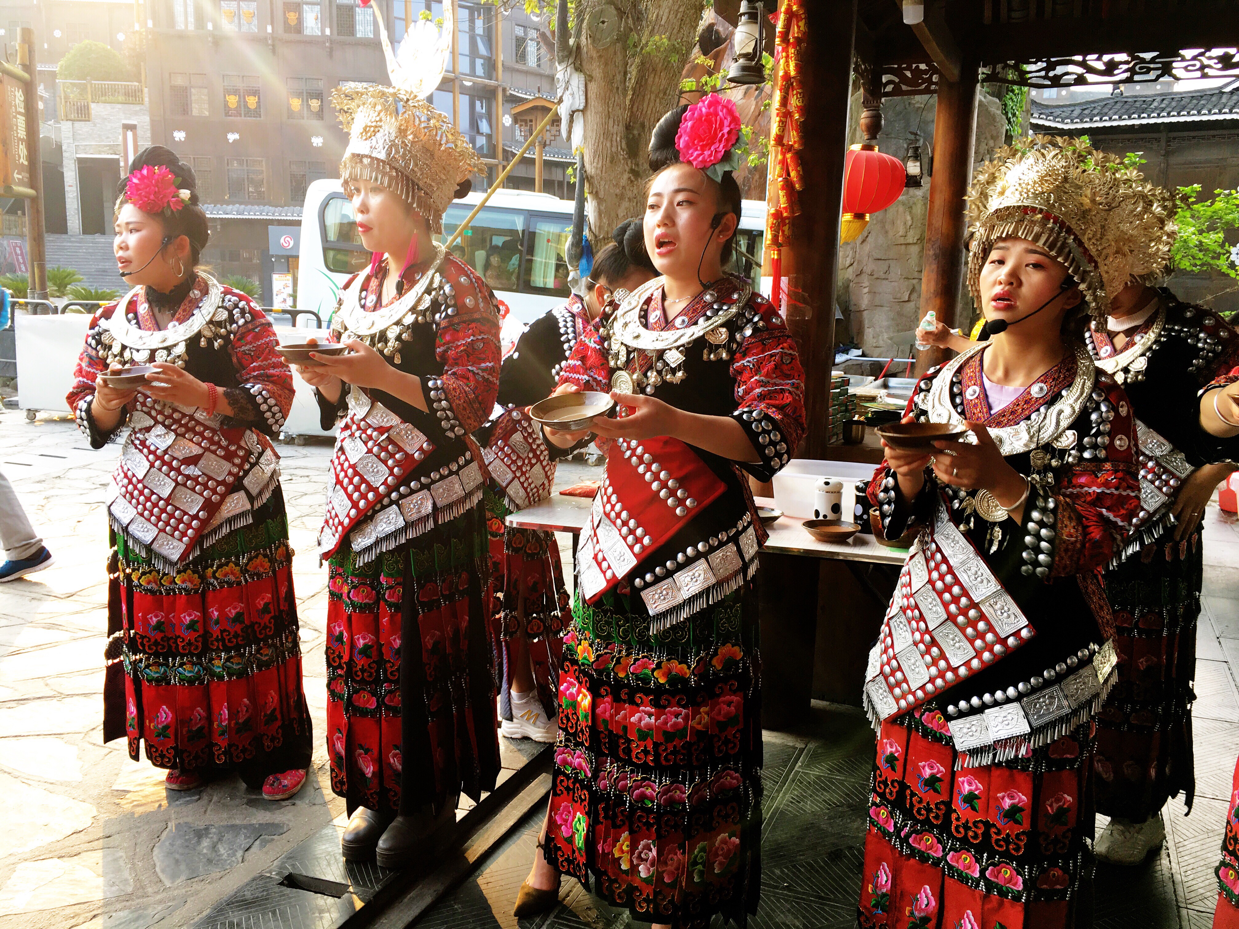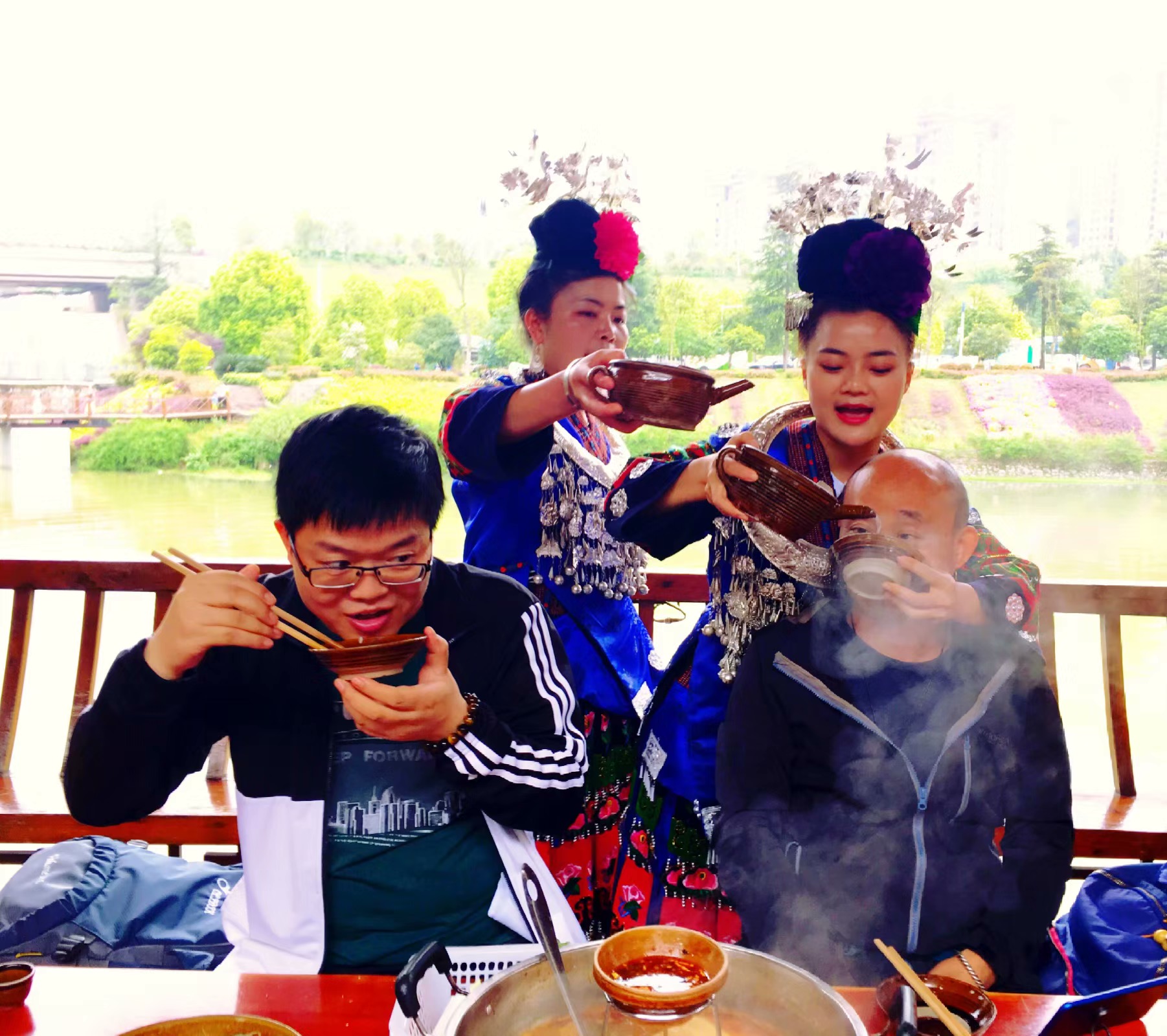 再看苗家妹子们,发髻盘在头顶,髻上插着大花,穿着色彩艳丽的服饰,一个个美若天仙。我们团里一干男士喜形于色,眼睛瞪的滴溜圆。最有意思的是敬酒的时候,男士们,宁愿被美女拧掉耳朵,宁肯喝醉,也不肯撒手。苗家这个习俗太有意思了,逗的游客哈哈大笑,笑的全场沸腾。端上桌第一道菜是每人一个红鸡蛋,这是苗家迎宾的一项重要仪式,寓意吉祥如意、平安健康。接着上桌的美食有:酸汤鱼、酸菜、腊肉等,总之,以酸味为主。我想起导游说的,三天不吃酸,走路打转转,就笑弯了腰。
