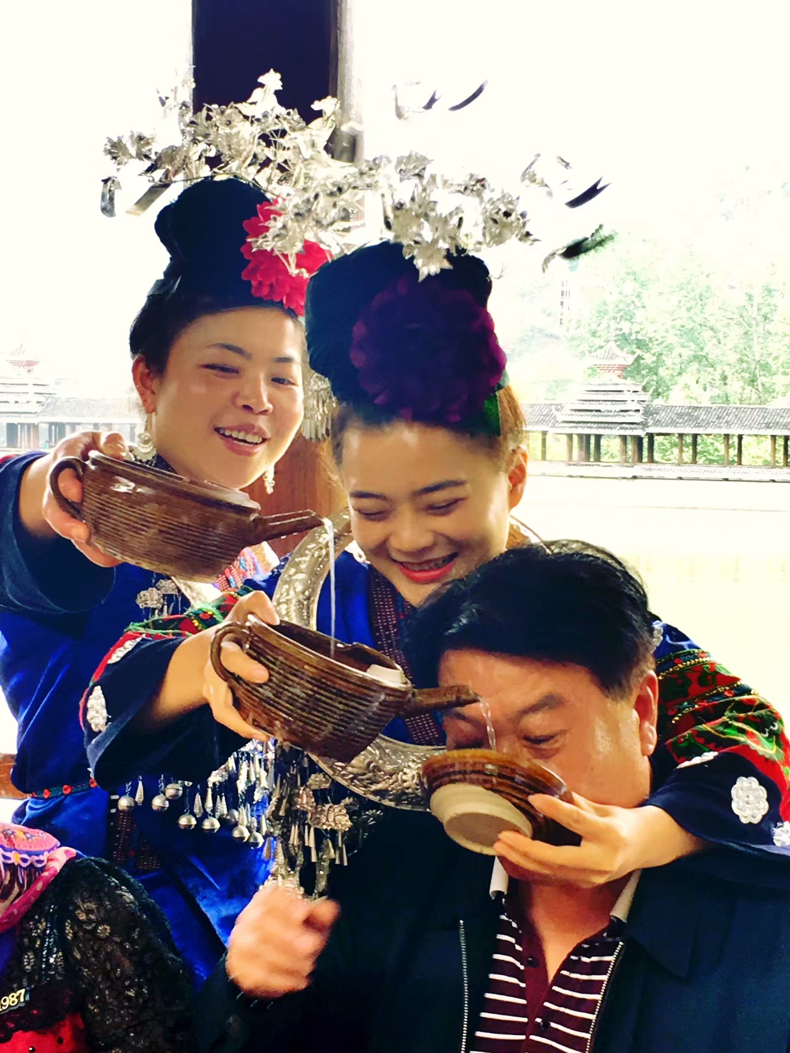 长桌宴敬酒达到了高潮,苗妹们手持牛角,给游客敬酒。弯弯的大牛角,能装一两斤酒,客人喝酒时双手不能碰牛角,苗妹们拧着客人的耳朵,往嘴里灌,不喝还不行。边灌,边唱歌,还用身体撞,那些大老爷们被拧的疵牙裂嘴,被撞的五迷三道。苗妹们只给老人和妇女留情,对男士毫不手软,乐的众人捧腹大笑。
