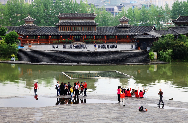 来到苗寨的第二天,导游带领大家去凯里博物馆参观。由于来的早,博物馆还没开门,我们便在博物馆门前的广场上参观。不得不说,这处广场十分漂亮,山水相依,亭台楼榭,倒映水中,美不胜收。博物馆外观宏伟雄壮,融苗侗建筑艺术风格为一体,是凯里市城区一幢标志性建筑。博物馆开门时,我进去匆匆看了一下,主要囊括了黔东南州各个少数民族的特点和风俗习惯介绍。我对此不太感兴趣,瞄了几眼就出来了,我喜欢广场上的景致。