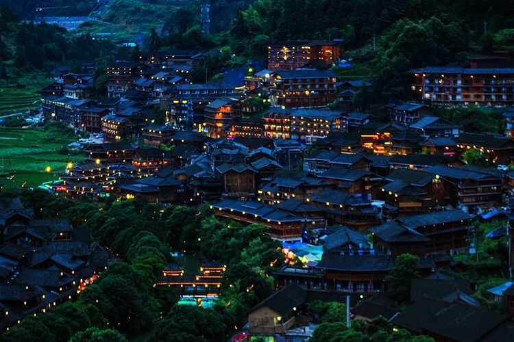 夜幕终于降临,我坐上观光车来到观景台看夜景。到了景点一看,人山人海排着长队。这一等就是一个多小时,天黑透了总算进了景区。沿着上坡路前行,人多的没了边,我好容易挤到观景台,前面几排人墙,密不透风,我只能透过缝隙往山下瞧。这一看不得了,我不知用什么语言来表述苗寨的美,只能用壮观、唯美这样词语。苗寨的夜景真是不同凡响,千万盏灯光把苗寨变成了灯的海洋。灯火璀璨处,一颗颗小星星,闪闪烁烁,好似天上繁星落在了人间一般,是何等的美丽。这种美,既震撼心灵,又令人心醉。