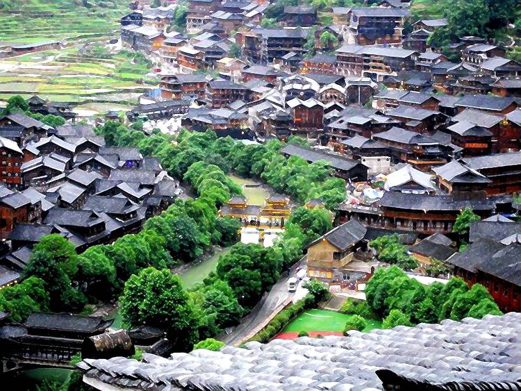 西江千户苗寨在凯里。汽车拉着我们向苗寨进发。沿途山明水秀,风光旖旎。一层层梯田盘旋山间,绿油油的庄稼,就像一幅美丽的图画。导游介绍,西江千户苗寨是一个原生态保存最完好的村寨,它由10余个自然村相连成片,是目前中国乃至世界最大的苗族村寨。这里保留着传统的苗族习俗。导游还着重介绍了独特的屯堡文化。