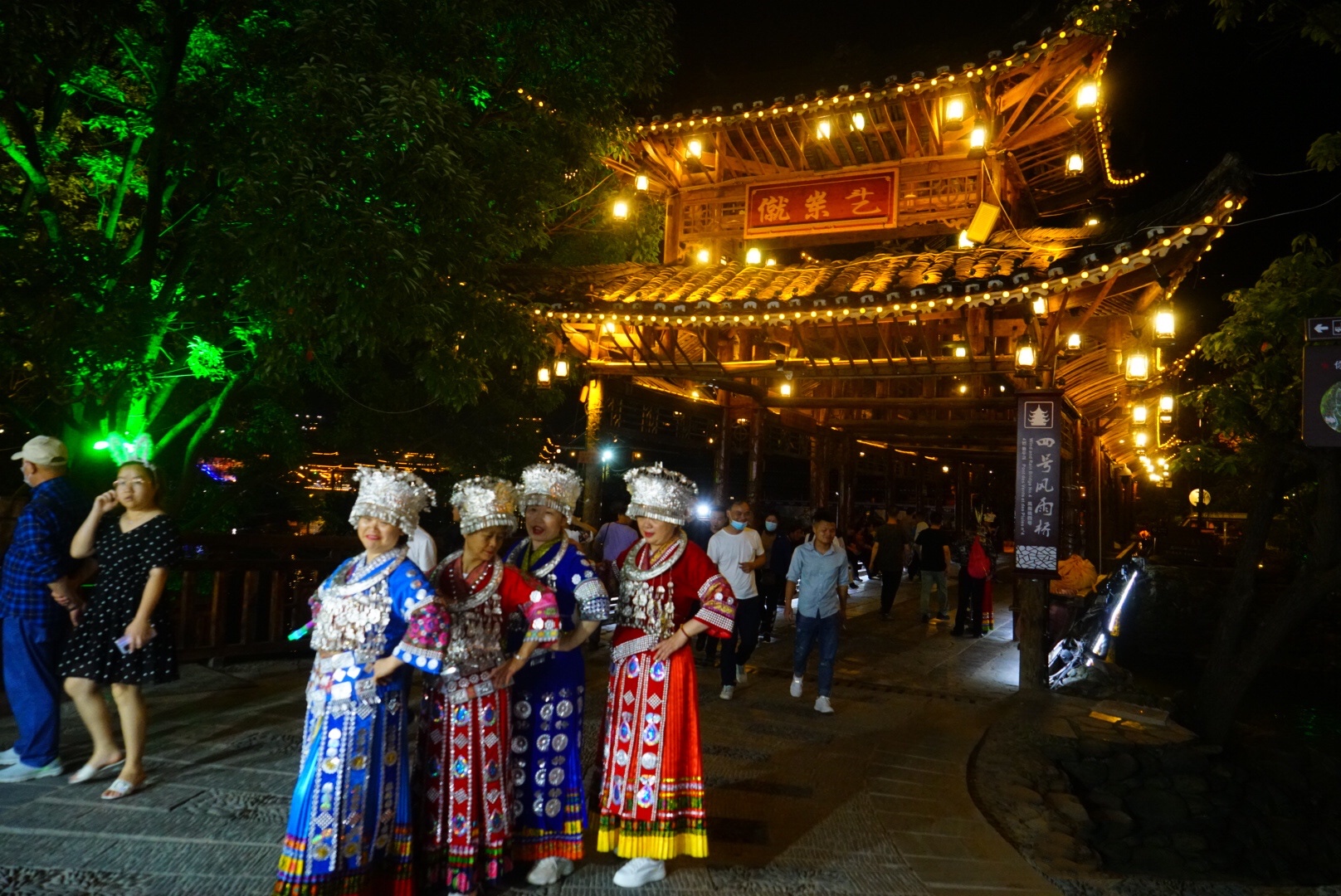 安顿好后,导游宣布,晚七点集体坐车去观景台看苗寨夜景,观光车自理,现在先回房休息。我一看表下午三点,离夜晚还有几个小时,苗寨还没看就休息,这不是白白浪费时间嘛。为此,我跟导游请假,我现在就去逛苗寨,晚间自己去观景台。导游说苗寨白天没什么好看的,只有夜景好看。看我态度坚决,导游又不放心的说,走丢了概不负责。我说你放心,鼻子底下有嘴,走不丢的。我把行李拎到房间,洗了把脸,背起相机,到前台拿了一张酒店名片,就一个人去逛苗寨了。