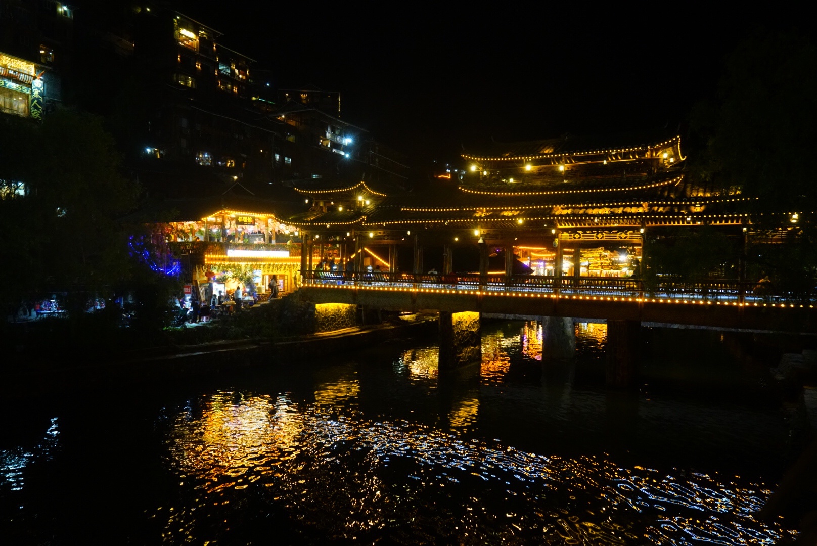 桥上人来人往,还有苗民休闲唠嗑。听他们说,这样的桥苗寨有五座,一座一个样子,这是一号风雨桥,也叫龙潭桥。我见桥的两边有两条分叉路,一边是游方街,一边是我走来的古街。游方街在对岸,只见密密麻麻的吊脚楼,全是客栈、酒店、商铺。从桥上过来,我一直走到五号风雨桥,把整个街道全逛了一遍,累的够呛。其中,三号风雨桥最为出名,因为这桥叫情人桥,游客慕名而来,年轻情侣牵着手,成了一道亮丽的风景。