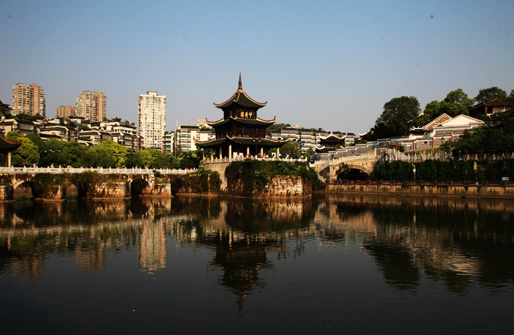 到贵阳不能不打卡甲秀楼,这可是贵阳赫赫有名的地标建筑。为此,我用一整天的时间专门游览甲秀楼及符近的景观。酒店门前有公交车,我早早的坐车来到甲秀楼。清晨的甲秀楼静谧安祥,偶有晨练的人从河堤走过,微风吹动河水,波光粼粼,甲秀楼兀立河岸巨石上,四周是高楼大厦,在这现代化的氛围中,甲秀楼傲然挺立,更显古意悠悠,独领风骚。我在桥下观赏,无论从哪个角度,甲秀楼都美不胜收。