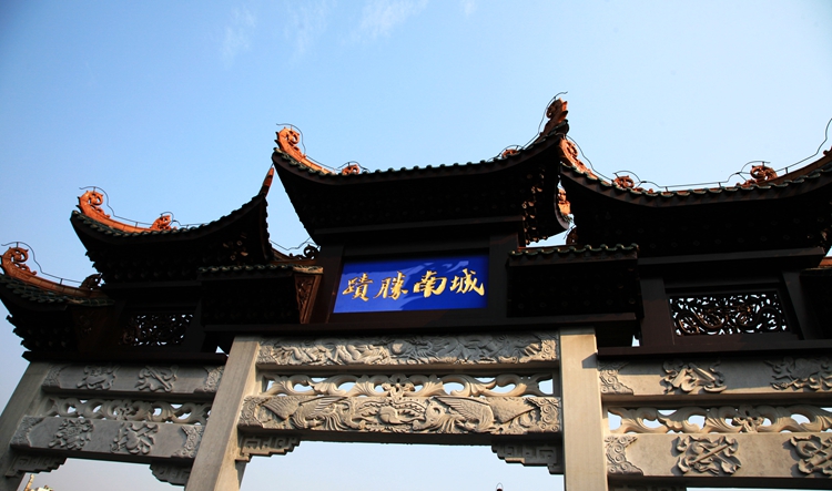 我从桥上去甲秀楼。桥头立有石碑坊,上书“城南遗迹”四个大字,桥上还有雕刻的石狮,威风凛凛。桥上非常拥挤,人流如织,全是外地的游客。我随着人流走进了甲秀楼院子,这里是免费景点,楼门紧闭,我不知为何不让登楼?我围着楼转了一圈,这座楼不甚高大,是三层三檐四角攒尖顶阁楼式建筑,古色古香,古朴自然。听说此楼几经修缮,有400多年的历史。甲秀楼正面三层悬挂匾额“甲秀楼”三字,系清宣统年间学者谢石琴所书。十年动乱中散失,后寻回刻有“秀”、“楼”二字的两块,另据过去照片,配写“甲字。