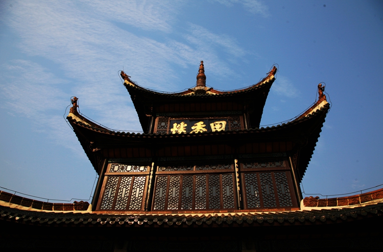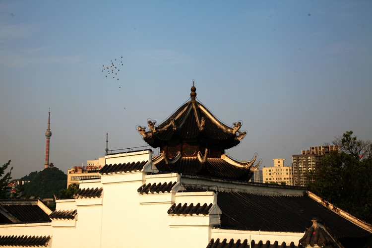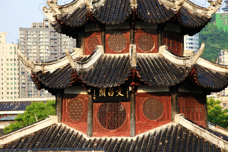 站在路边我看见有一个指示牌上书“文昌阁”。我问路人,文昌阁有多远?那人说走三个红绿灯就到了。于是我迈开腿走了四个红绿灯才找到文昌阁。与甲秀楼不同的是,这里几乎没有游客,只有几个本地人带着小娃娃在玩耍。站在城墙上眺望,一座古朴雄伟的阁楼映入眼帘,我把镜头拉近,这座阁楼非常古老,外形很是独特有九个翘角,砖瓦已斑驳尽显沧桑。文昌阁禁止进入,只能站在外面观看。