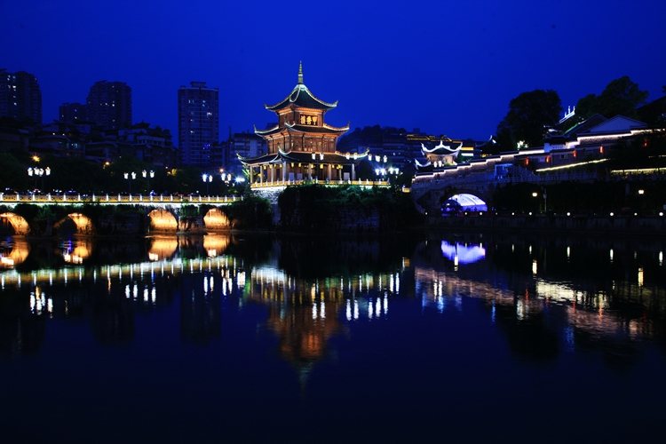 文昌阁下面有个门洞,穿过去是一条热闹的小吃街。傍晚十分,小吃街各种小吃一字排开,人来人往热闹非凡。我因惦记着甲秀楼的夜景,随意看了看就去了甲秀楼。我在南明河畔看夜景,这是我在白天选的位置。可惜我没带三角架,拍夜景手持不稳,只好提高感光度,又找了个桥墩,把像机放上面,凑合着拍成了现在这样子。不得不说,甲秀楼的夜景流光异彩,美伦美奂。