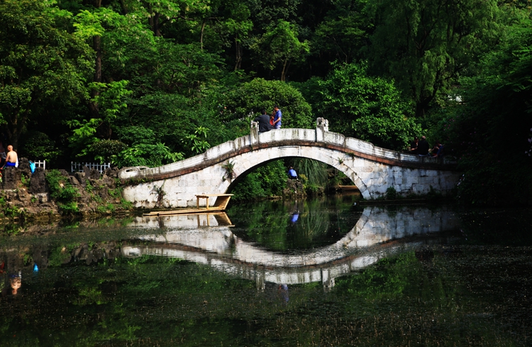 走入黔灵公园,映入眼帘的是青山绿水,给人以清爽的感觉。我尽量避开太阳,躲在树荫下行走,能感觉到丝丝凉意。黔灵山公园很大,山不是特别高,山头有“黔南第一山”五个红色的大字。山下有个湖,叫七星潭。潭中有一石桥,桥上人来人往,倒影水中,甚是好看。我随着人流穿过遂道,既见一座大湖,这湖叫黔灵湖。远看湖水碧绿,走到近前却不干净,水中漂浮着垃极。湖中还有游泳的人。我绕湖而行,两边是花草绿地,还有茂密的植被。站在湖边眺望,能看到拦水大坝,还有革命烈士纪念碑。