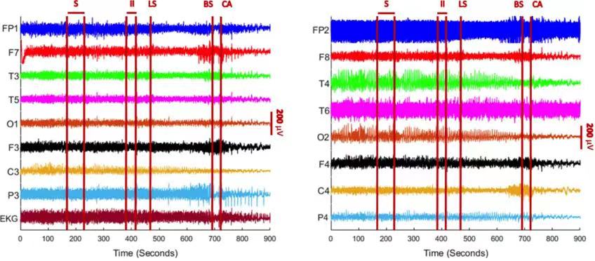 左图和右图分别对应左右脑脑电波,横坐标代表顺时依次发生的时间。