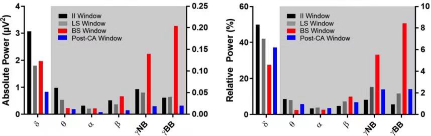 恰恰在这个个案中的确观察到了,在患者左脑神经活动受到抑制的时候,窄频带伽马波以及宽频带伽马波和阿尔法波的耦合最强,而在心脏骤停后,阿尔法波也在持续调节宽频带伽马波。