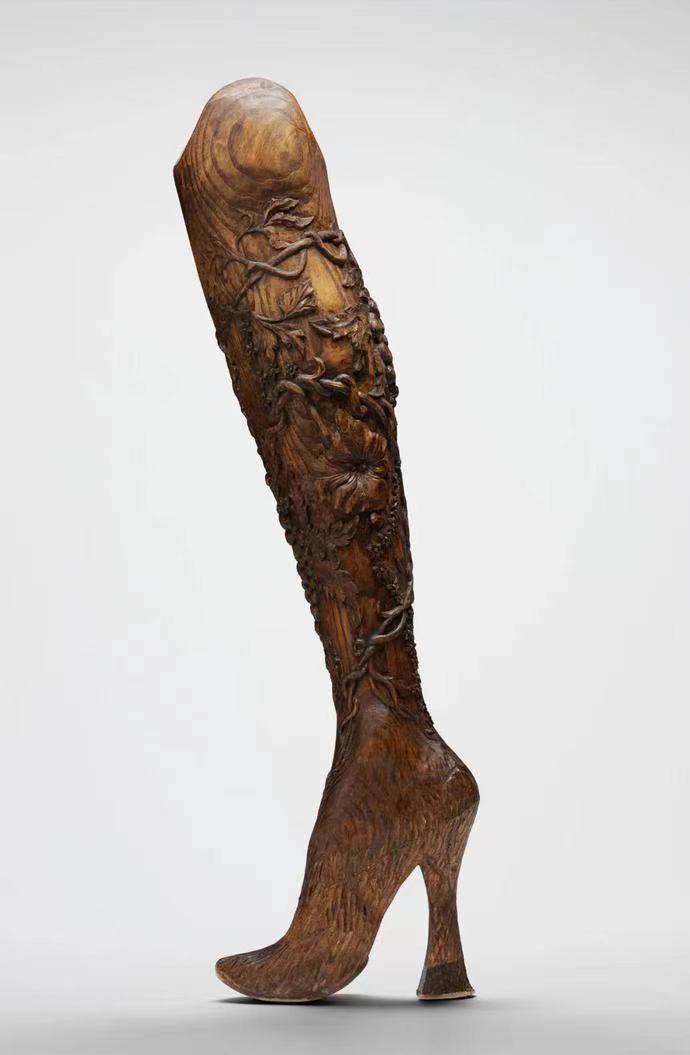 这是一双手工雕刻的榆木人腿,藤蔓交缠、繁花怒放,蜿蜒的木纹如星云流淌。