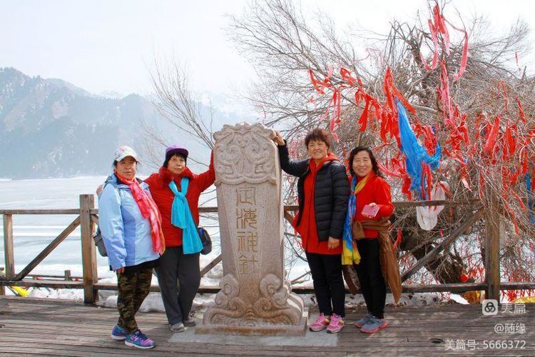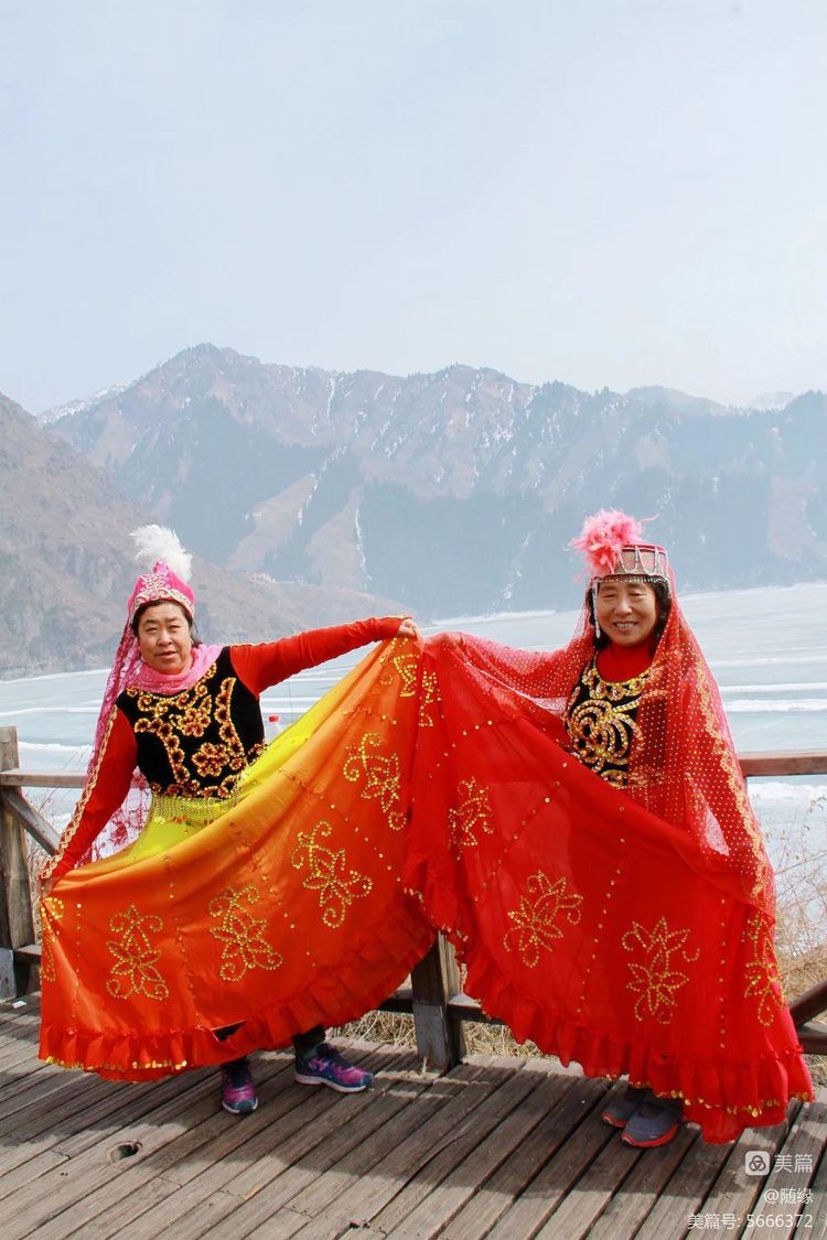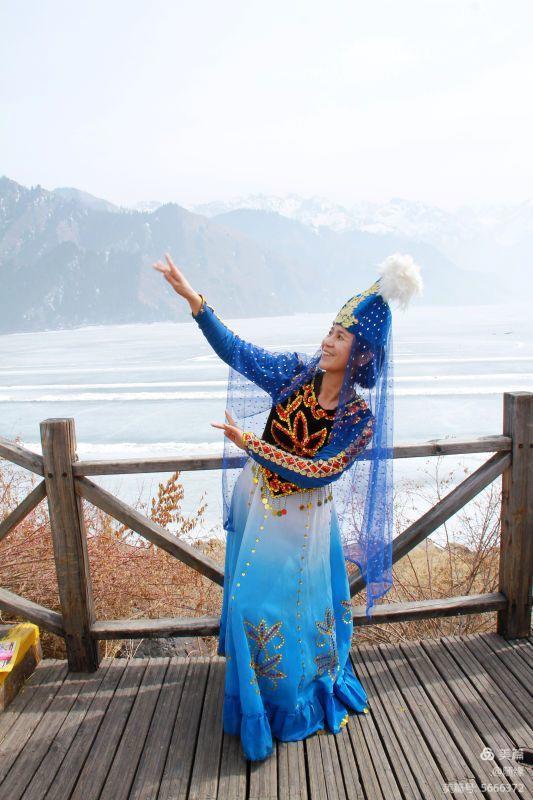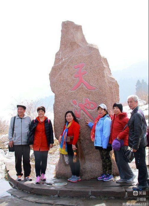 毛老师与众姐妹们换上漂亮的新彊服装在天池畔留影!