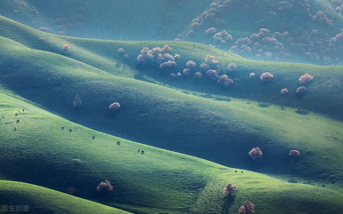 伊犁,一个壮阔而又细腻、豪迈而又温柔的人间:数千年来雪山、草原和水乡在这里梦幻联动,骏马秋风与杏花春雨的景观在这里编织交错,游牧文明与农耕文明在这里交织融合……
