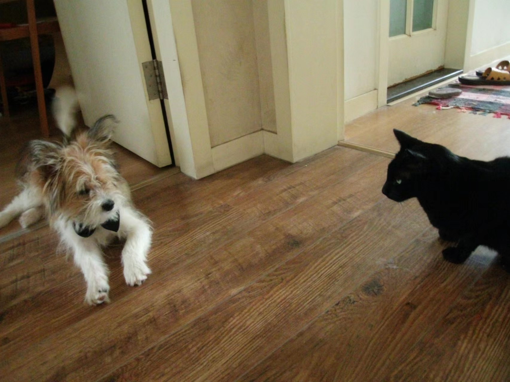 果然儿子回来第一天,对我们略显陌生,因为年幼的他在离开我个半年后,记忆已经有点模糊,开始认生。但是孩子对小动物天生的热爱,就一下让他转移了注意力,开始自来熟的、跌跌撞撞的追着小来福在新家跑来跑去。