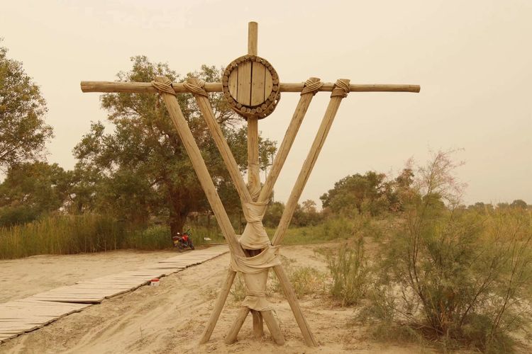 寨子里的建筑,一律依照罗布人习俗而建,铺苇为室,垒木涂泥为屋。罗布人是一个单一食鱼的民族,鱼的图腾随处可见。