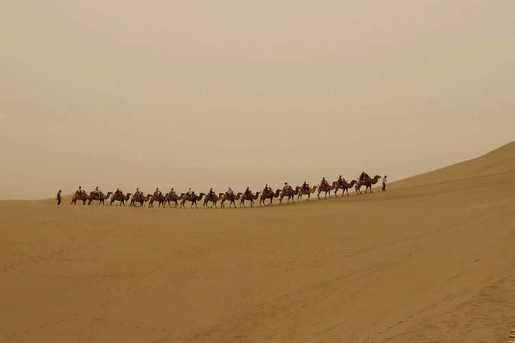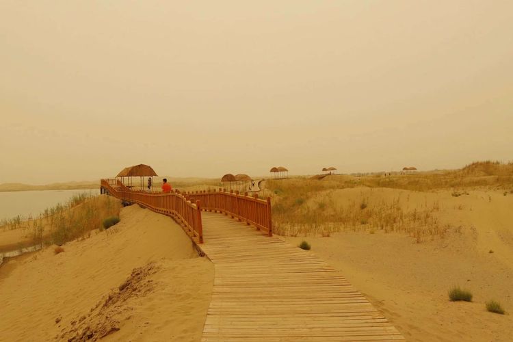 中国面积最大的塔克拉玛干沙漠在景区南面,连绵起伏,茫茫无边,汹涌澎湃。骑“沙漠之舟”涉沙海深处,看大漠风光,听驼铃遗韵,悠悠情怀,心旷神怡。
