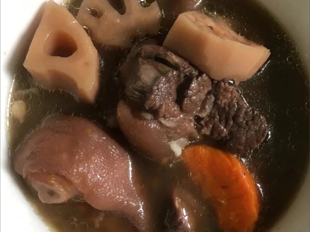 • 砂锅中倒入洗净,放入姜片、当归烧开,然后放入莲藕、胡萝卜、猪蹄、黑豆、红枣煲熟,用盐调味,撒入葱花即可。