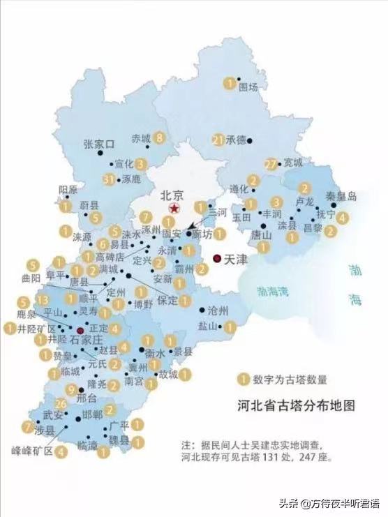 河北拥有丰富的古塔建筑资源,据不完全统计,河北现存古塔250座左右,分布在河北全境11个地级市内。古塔的年代跨度更是久远,从唐至清,均有建筑遗存,不少古塔更是建筑孤品。也因此,河北被不少人誉为“古塔建筑博物馆”。