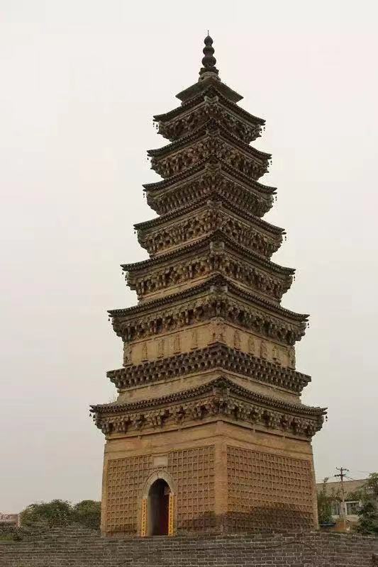 柏林寺塔,全称特赐大元赵州古佛真际光祖国师之塔,位于赵县城内,始建于元天历三年(公元1330年)。塔为八角七级密檐式,砖木结构,通高39.5米,坐于两层呈阶梯状的石砌台基上。塔的下部系砖砌须弥座,上部用砖仿木构做出斗拱、平座。