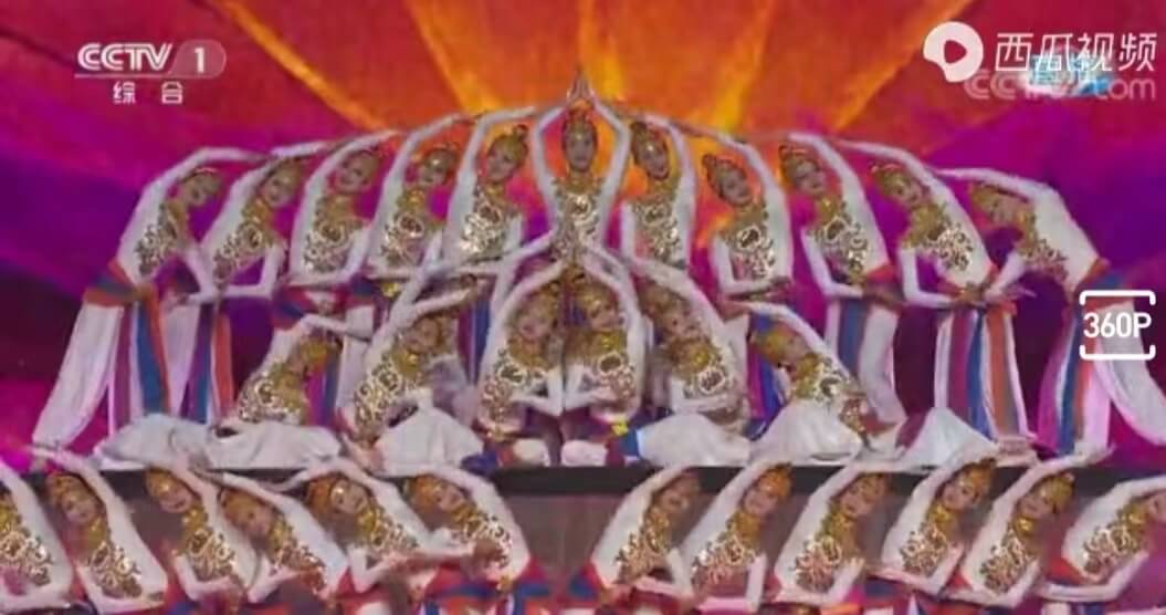 《丝路绽放》中,百位演员位于升降舞台形成的台阶上,配合数字影像技术,进行依次性和一致性动作的表演,呈现了新形式砌图操的魅力,将砌图操的表演形式推向更高艺术层次。百人纤纤玉手,绽放盛世花雨!穿越千年,丝路绽放!