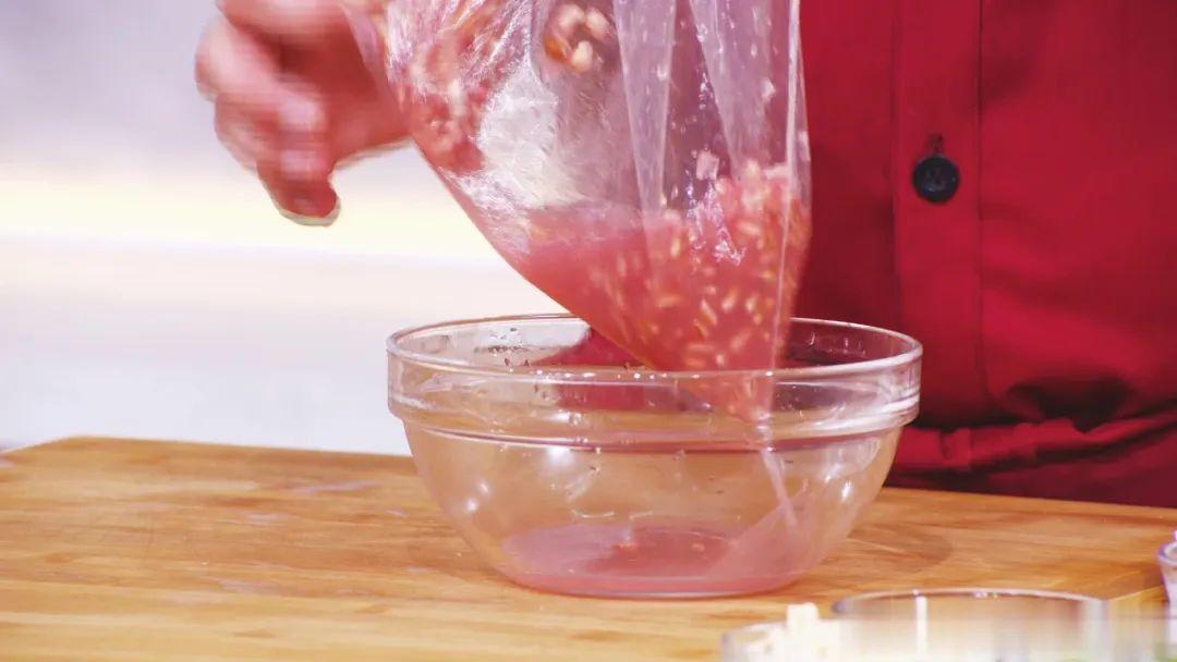 (3)将石榴籽装进干净的密封袋中,按揉碾压,再切掉袋子的一个角,挤出石榴汁即可。