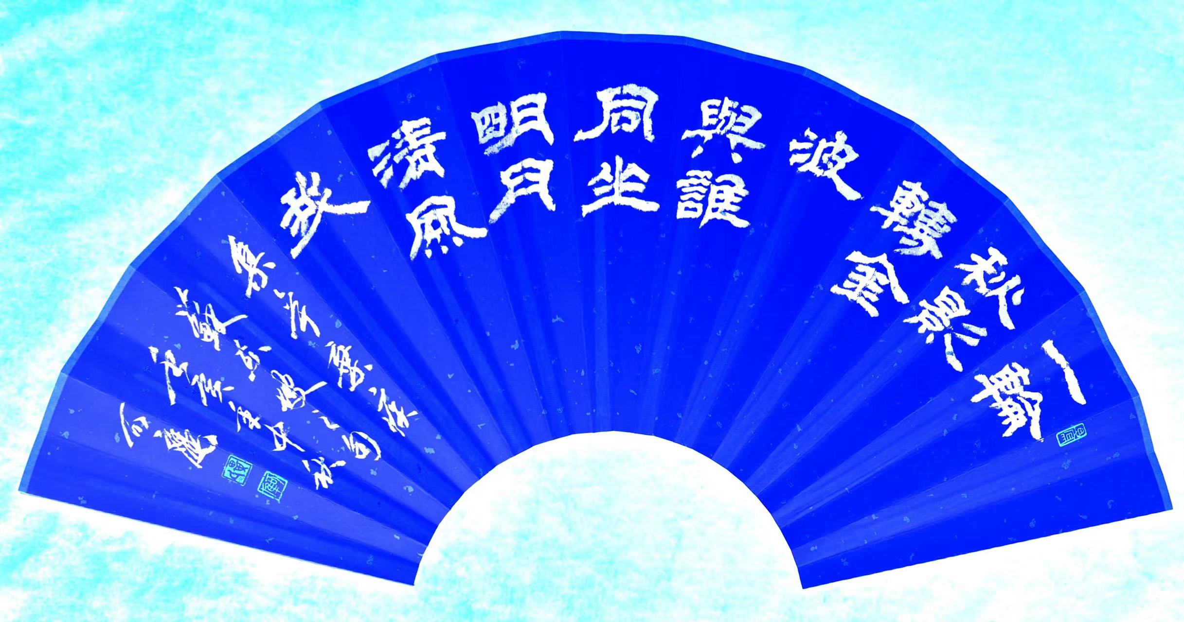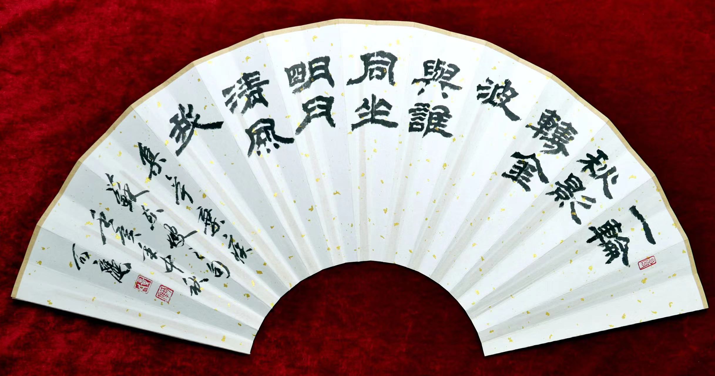 中秋佳节,仿东汉隶书风格,选辛弃疾词句:一轮秋影转金波;再加上苏东坡词句:与谁同坐?明月、清风、我,两句合璧于扇面之上。