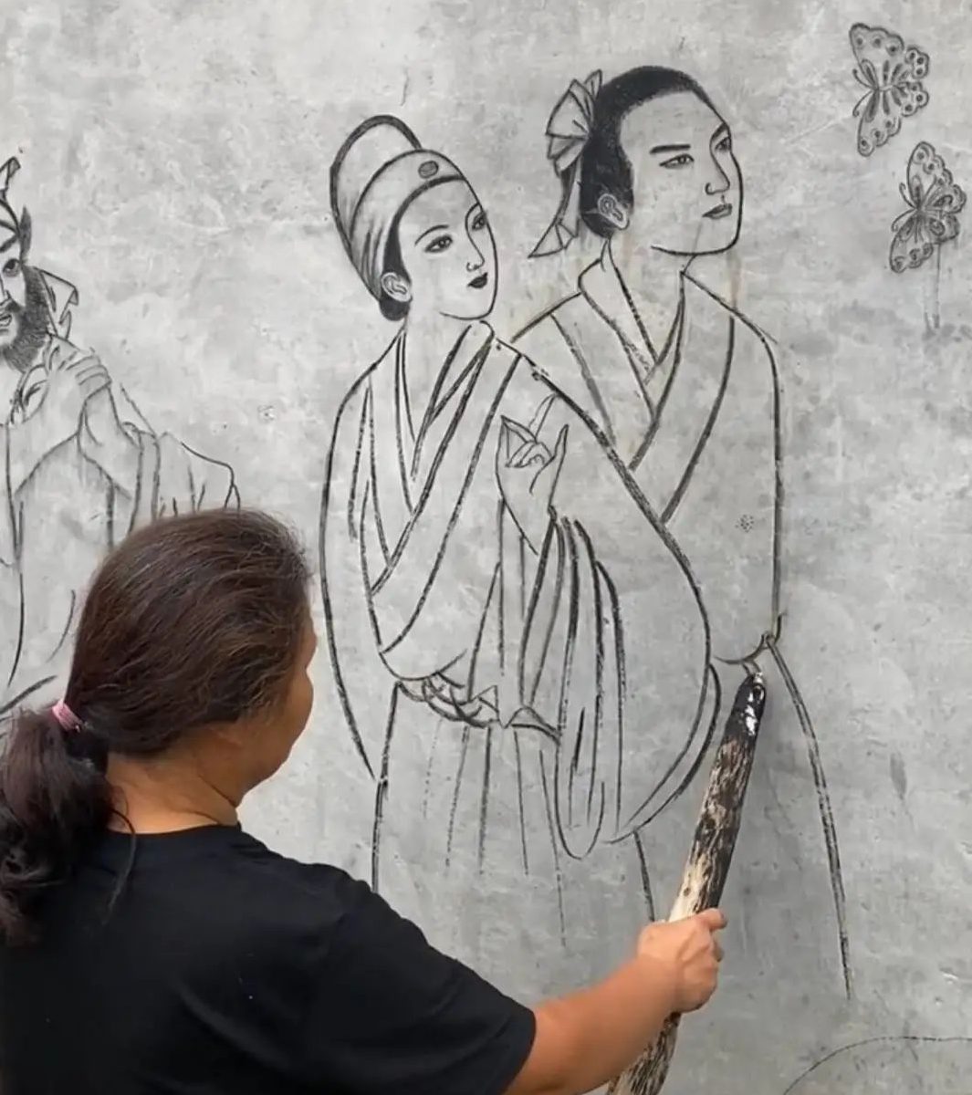 她以烧火棍为笔,以白石灰为颜料
