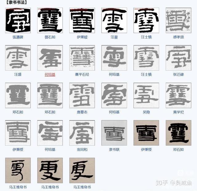 质疑之二:《书法大字典》中“雪”字的隶书写法,如果“雨”字头里的两点省略成一横,那么下面的“彐”字底,必须加上一竖,成了“丑”字底。“张迁碑”、何绍基、翁同和、吴隐等人的笔迹就是如此。所以如果非要说“雪”字是曹操真迹,那就等于说曹操写了一个白字。而依曹操对书法的热爱书写水平,这显然是不太可能的。