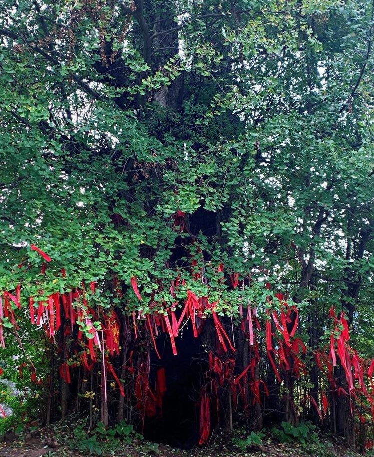 红丝带,有祝福之意。也有祈福之意。那就对老银杏树说一声:祝福您健康长寿,祈求您护这一方平安!