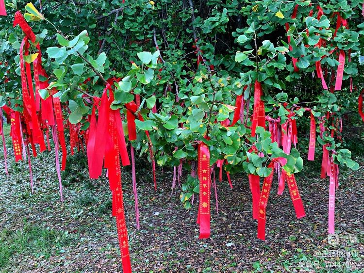4000岁高龄的古银杏树,被护栏保护了起来,树枝上挂满了红丝带,仿佛一位过4000岁生日的老人,被后辈们精心的打扮一番,又在其头发上插上了耀眼的红绒花儿。