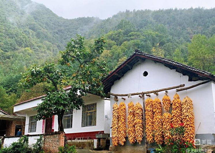 门口一棵高大的柑橘树,挂着累累的果实。迎着公路的整整一面墙上,挂着一串串的黄玉米,让人切身感受到“丰收”这两个字。