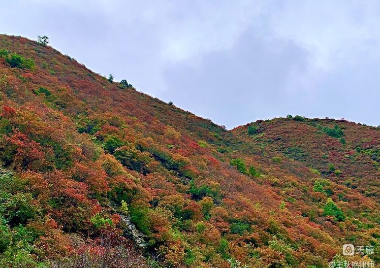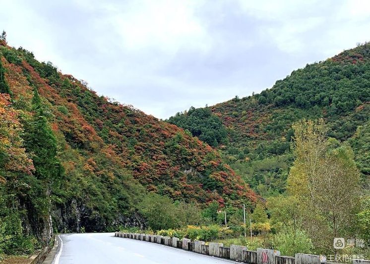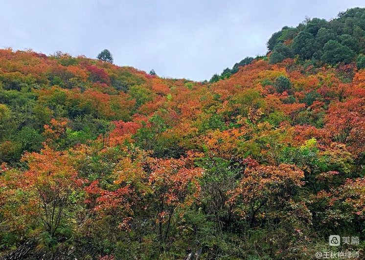 没想到车行至陕西宝鸡市凤县留凤关村附近,316国道两侧,竟然看见了满岭的秋色,如毛茸茸的地毯在高山上层层叠叠地铺展开来,赤橙黄绿的明艳色彩晕染出了连绵山岭上的秋色。