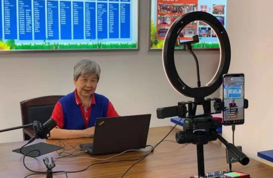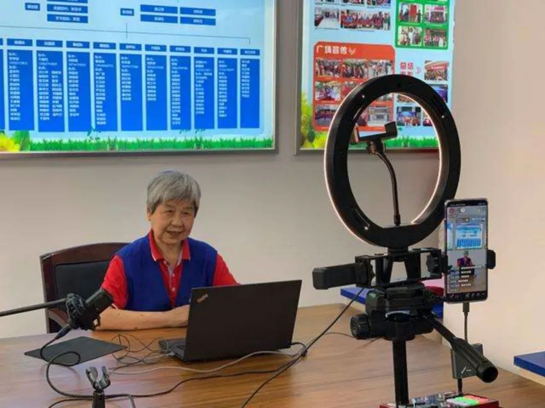 工作站设置了抖音直播间,直播专用的柔光灯就架在桌前。赵银光第一次做反诈直播是在网上老年大学的讲座上。后来在外面演出,她把手机架在旁边开直播,有北京的老太太留言说:“老同学!我看见你啦!”