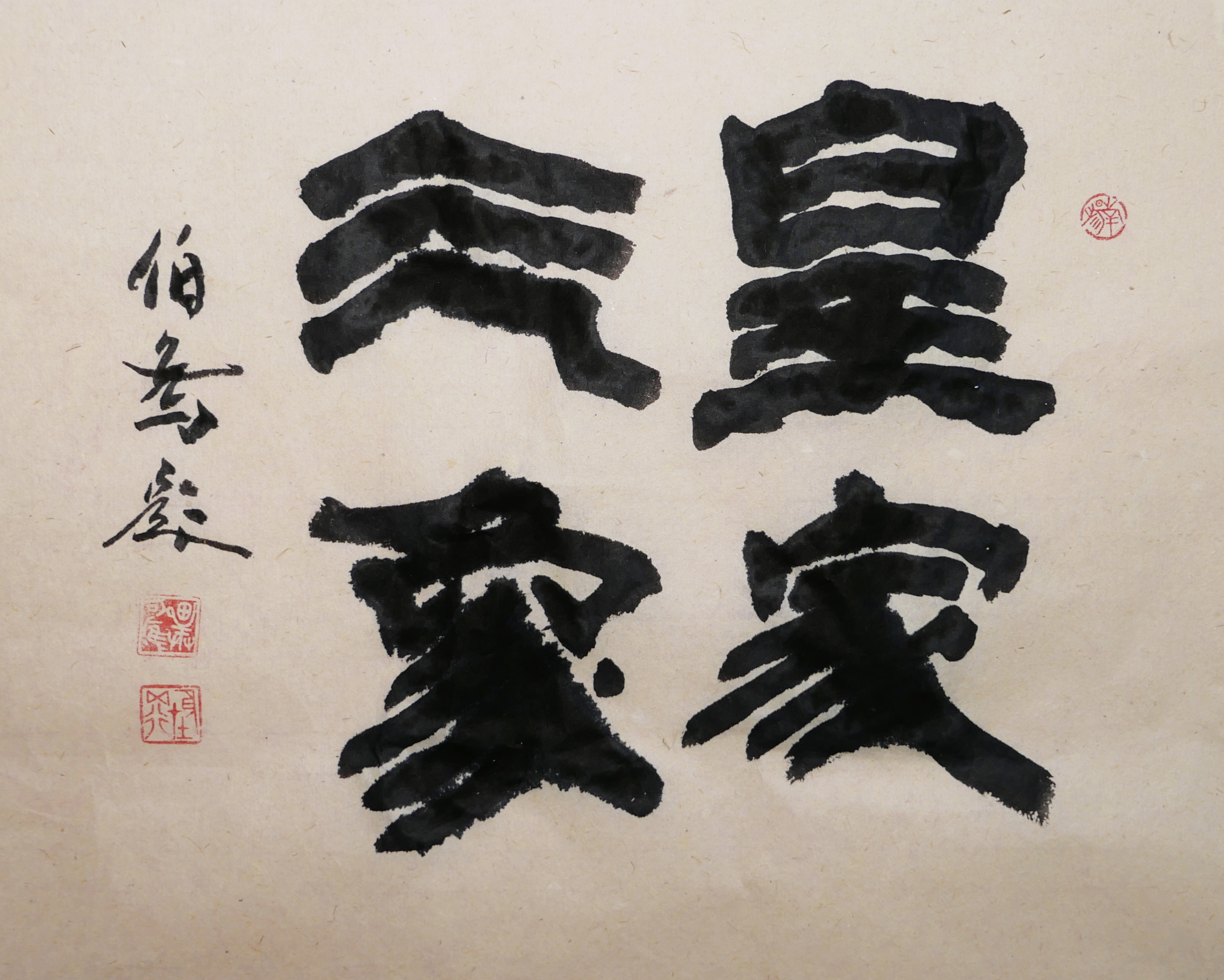 今天早课,在米色宣纸上书“皇家气象”斗方,由于含水量大,毛笔停顿处立即出现了渗化。