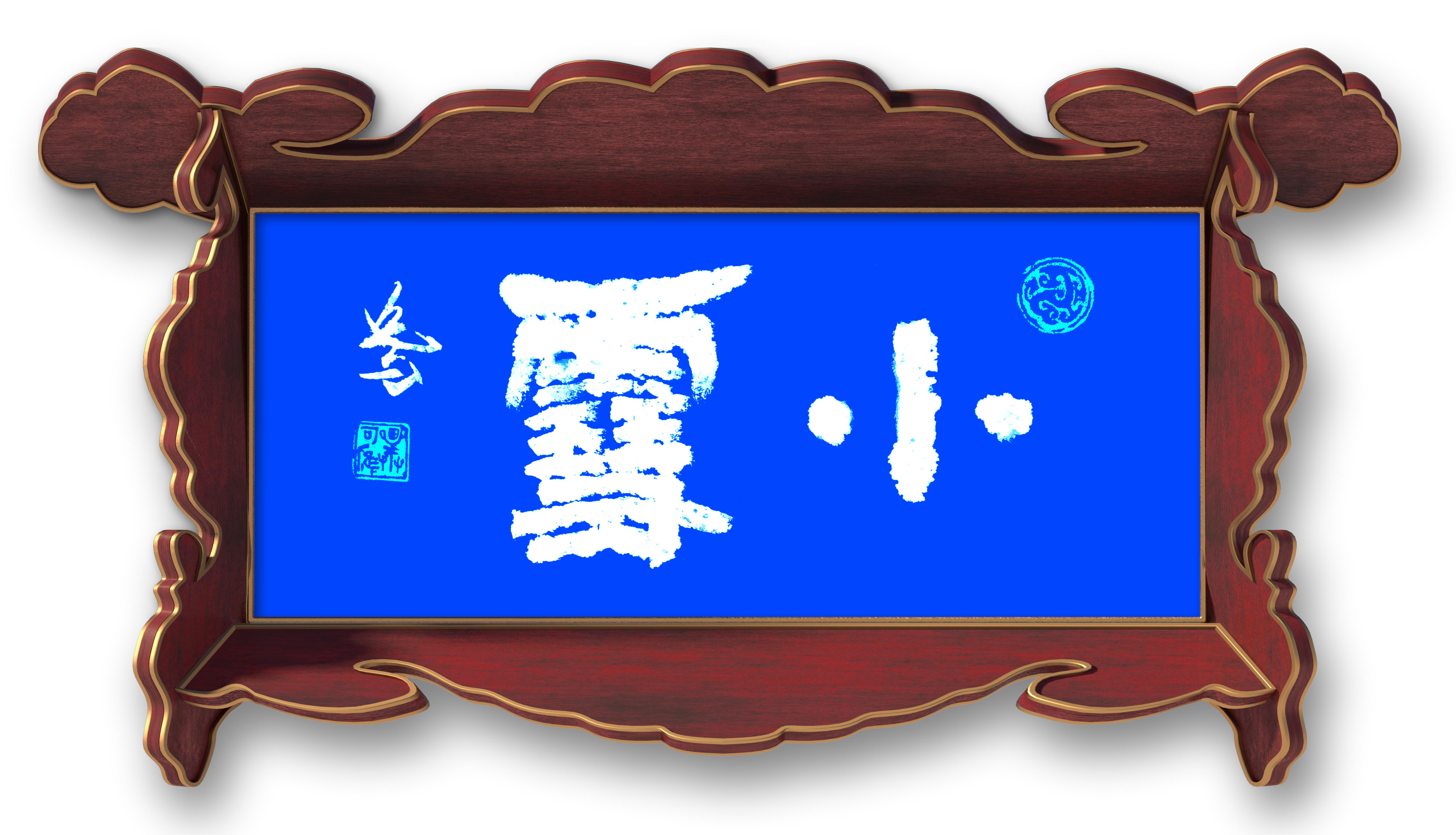 把“小”字压扁,左右点简化成两个小豆子;“雪”字更加复杂化,中间加上象形字的雪片(篆书写法),整个字看起来好像雪花纷纷落下。
