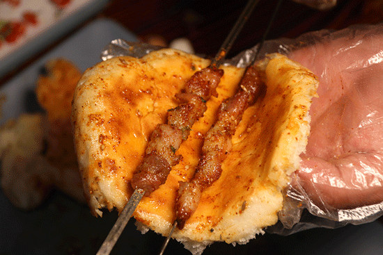 发面饼烤到绵软蓬松,夹着外焦里嫩的肉串,加上一口毛葱,分分钟让你体验一把饼夹肉的的惬意。