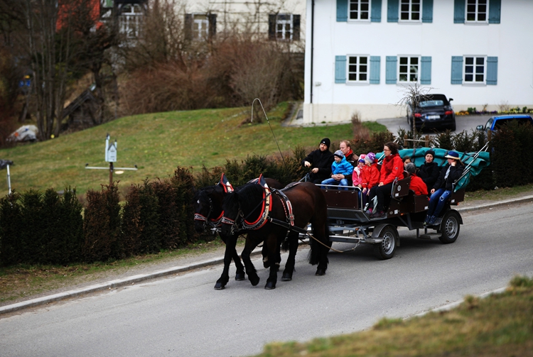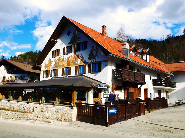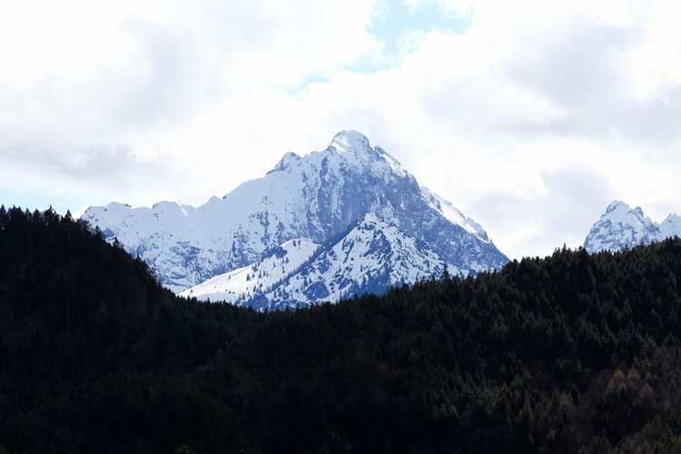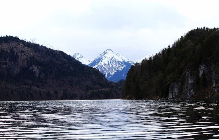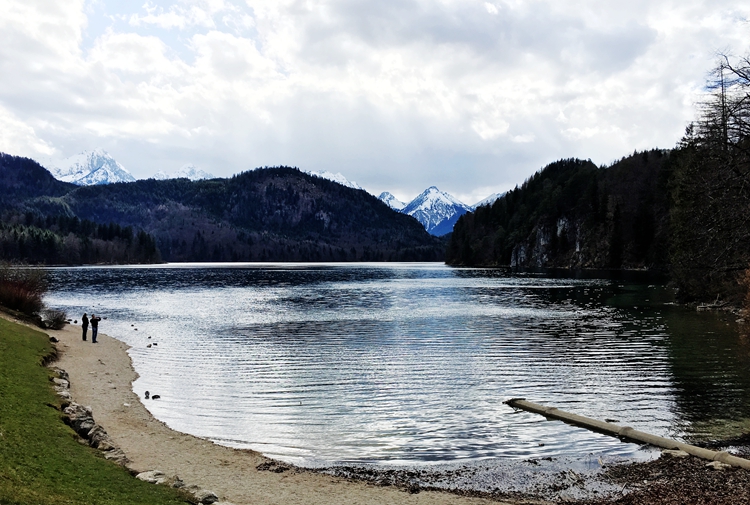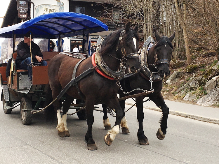 天鹅湖的对面是茂密的森林,中间是阿尔卑斯山麓,山上是长年不化的积雪。站在湖边,微风许许吹来,让人神清气爽,如临仙境。离开湖畔来到山脚下,游人较多,且大都是中国游客。路两旁的建筑多为两层,颜色艳丽别致,不时有马车从身边驶过,嘚嘚的马蹄声,仿佛从远古而来,恍如隔世。