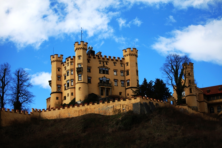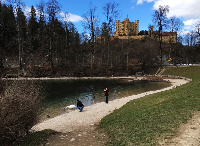 新天鹅堡对面的山上,也耸立着一座城堡,叫旧天鹅堡,这是路德维希二世小时候居住的地方。这座城堡淡黄色,在蓝天白云下,非常漂亮。可惜两处城堡无缘进去观赏是憾事。富森山下有一个天鹅湖,湖水清澈见底,湖中天鹅游弋。这些天鹅不怕人,大摇大摆在岸上与人合影,煞是可爱。