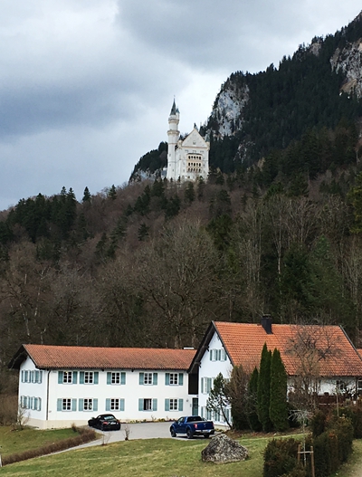 晚间我们下榻德国边境奥地利一家酒店。这家酒店座落在山坡上,一座座的联排别墅规模很大。进入房间,里外套间超大。墙上挂着画,地上铺着地毯,装饰华丽。推开窗子,雪山映入眼帘,风光极美。第二天,早餐丰盛,大家饱餐毕,赶往富森新天鹅堡。