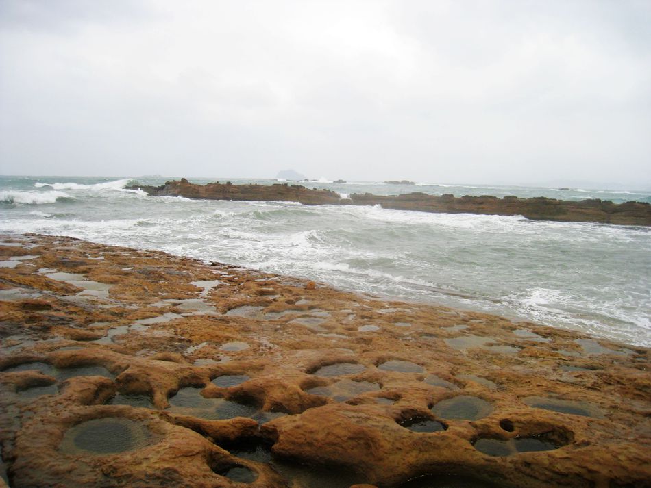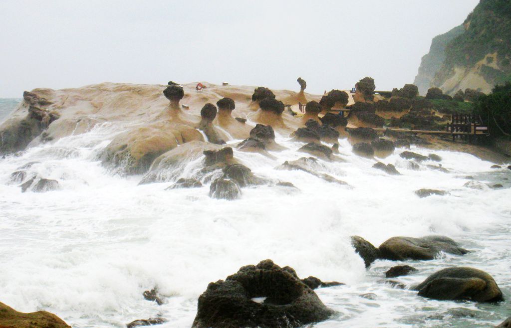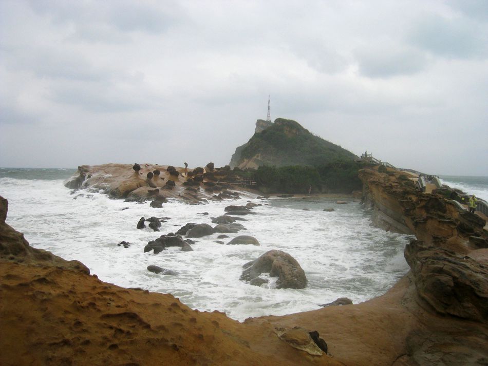 看着近在咫尺的美景,竟被巨浪阻止了脚步,让人甚感遗憾。没奈何,生死悠关,谁也不敢冒这个险。我爬上礁石最高处,把小卡机的镜头拉近,那些蕈状岩石头若隐若现,我找了许久才找到那个女王头像,她雍容尊贵,任凭风吹浪打,巍然耸立。我看的惊呆了,任凭导游在下面扯着嗓子呼喊,快下来有危险!此时风力极大,浪花已溅到我的脸上,衣服也被打湿,才不甘的下了碓石。我为没能到近前和女王合影而懊恼不已。野柳确实是台湾最具特色的景区,是没有之一。